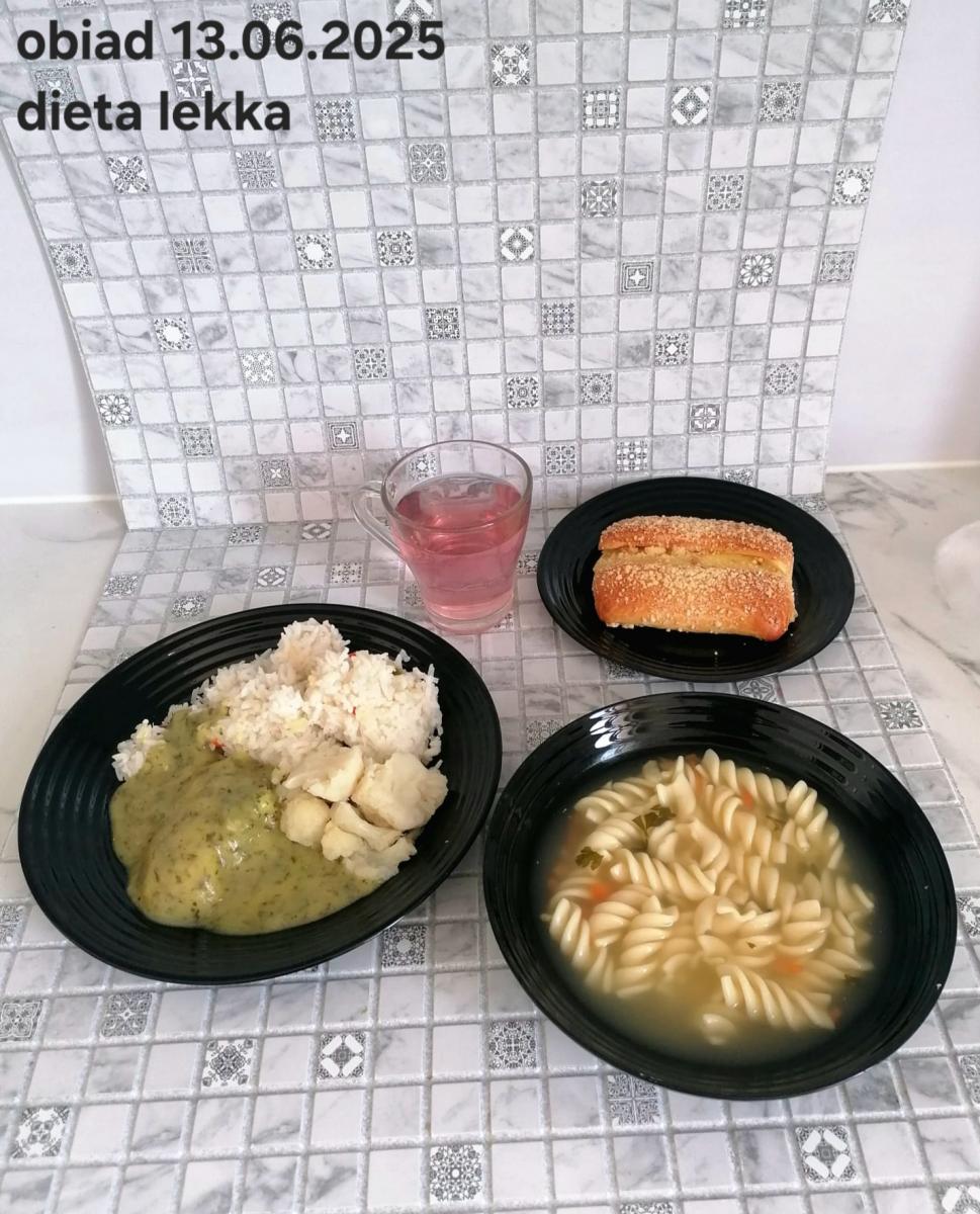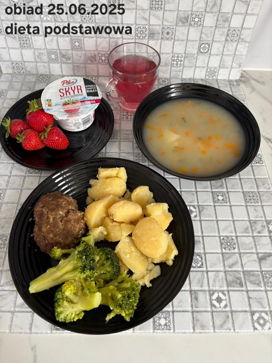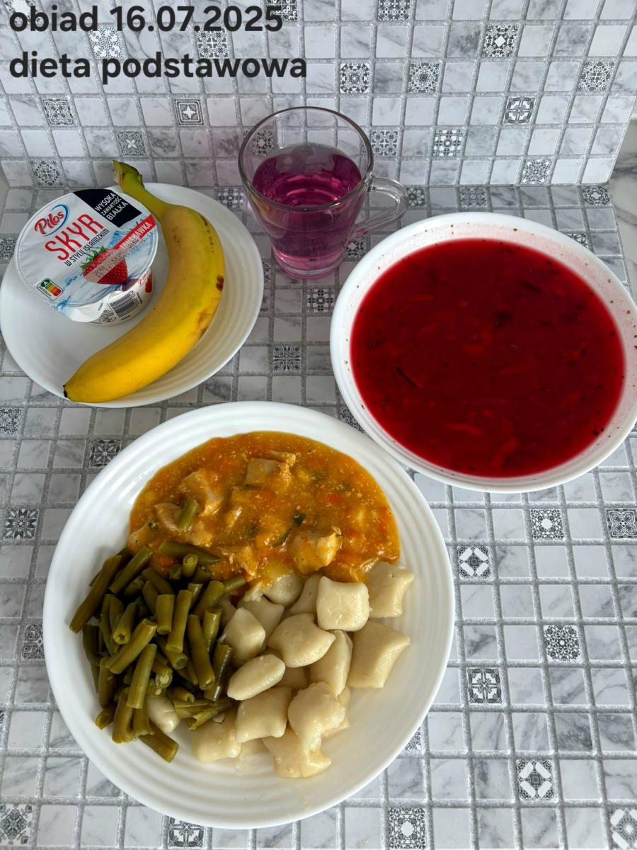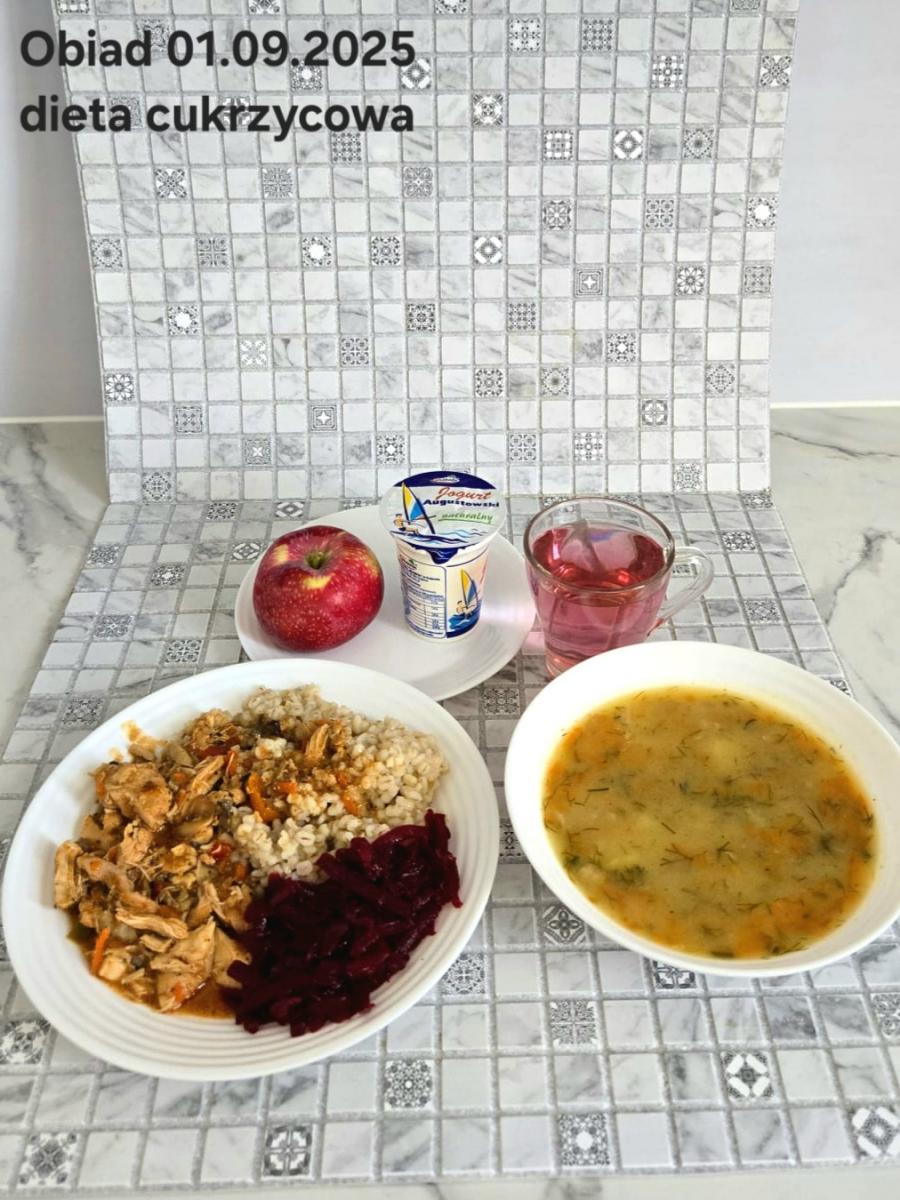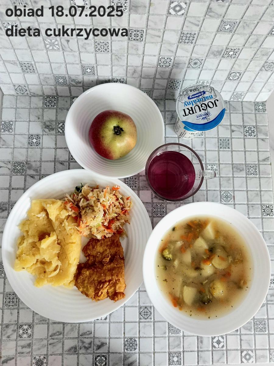 B,ZOL (cały), DZ: Zamiast kaszy- KOPYTKA(ziemniaki, skrobia ziemniaczana, mąka pszenna(1), jaja(3)) (250g), schab podany w formie gulaszu B: barszcz bez śmietany, sos na napoju sojowym (6) (zamiast śmietanki) L, L (W,T) zupa bez dodatku śmietany zamiast kaszy –KOPYTKA(1,3) (250g) Zamiast schabu indyk w wersji lekkostrawnej (filet z indyka- 100g, olej rzepakowy- 10g, papryka- 20g, marchew- pół średniej (22g), koncentrat pomidorowy- łyżeczka (12g), bulion warzywny(9)- 50ml ) L, L(W,T), Z, Z(PD): zamiast surówki brokuły (145g) z dodatkiem oleju rzepakowego (5g) C: Kompot bez dodatku cukru, Barszcz z dodatkiem mąki pełnoziarnistej (1) W: Zamiast surówki brokuły (145g) z dodatkiem oleju rzepakowego (5g) |