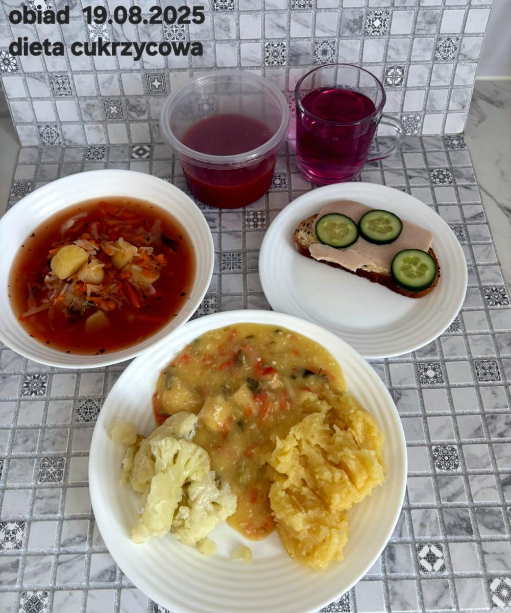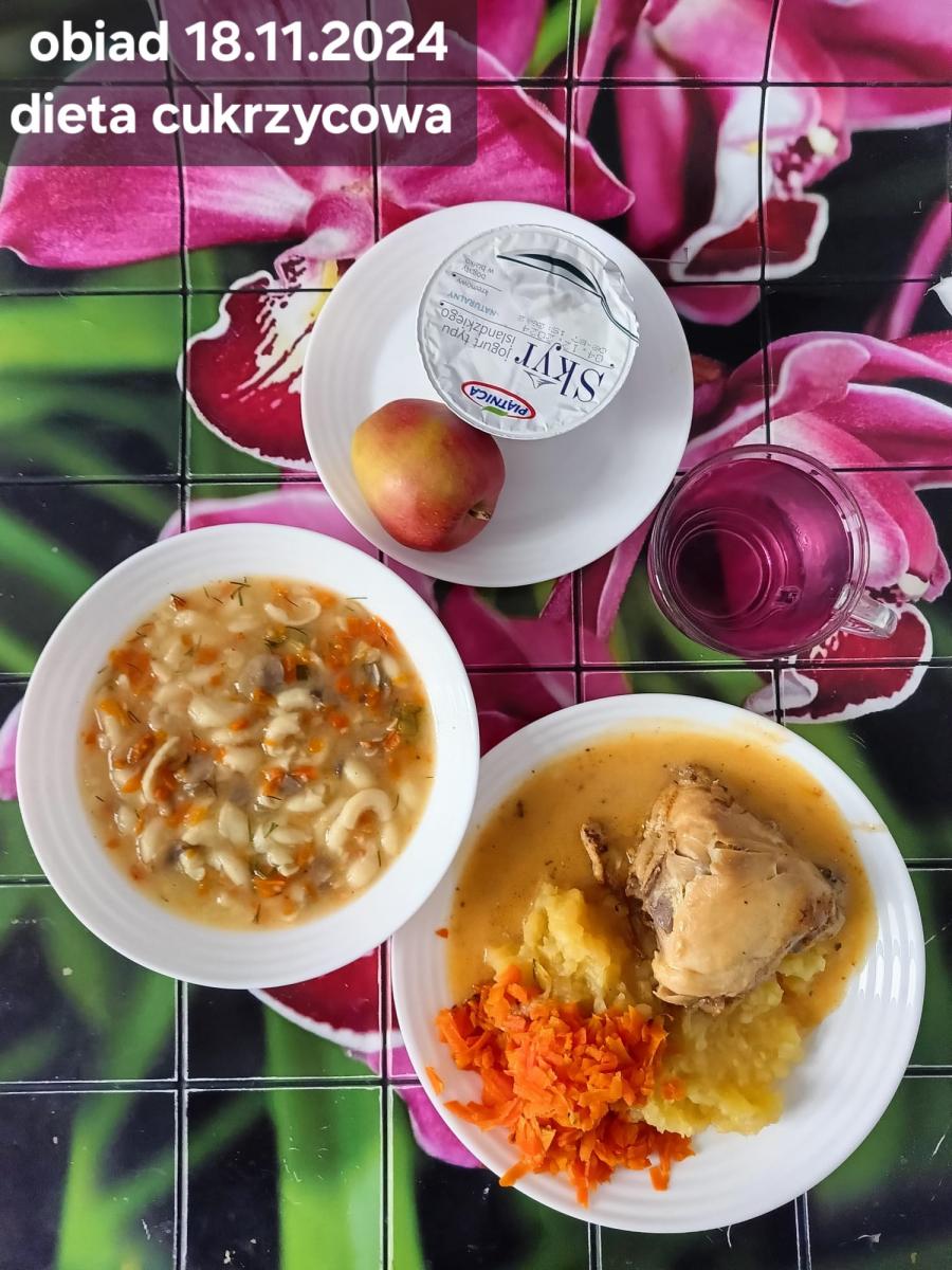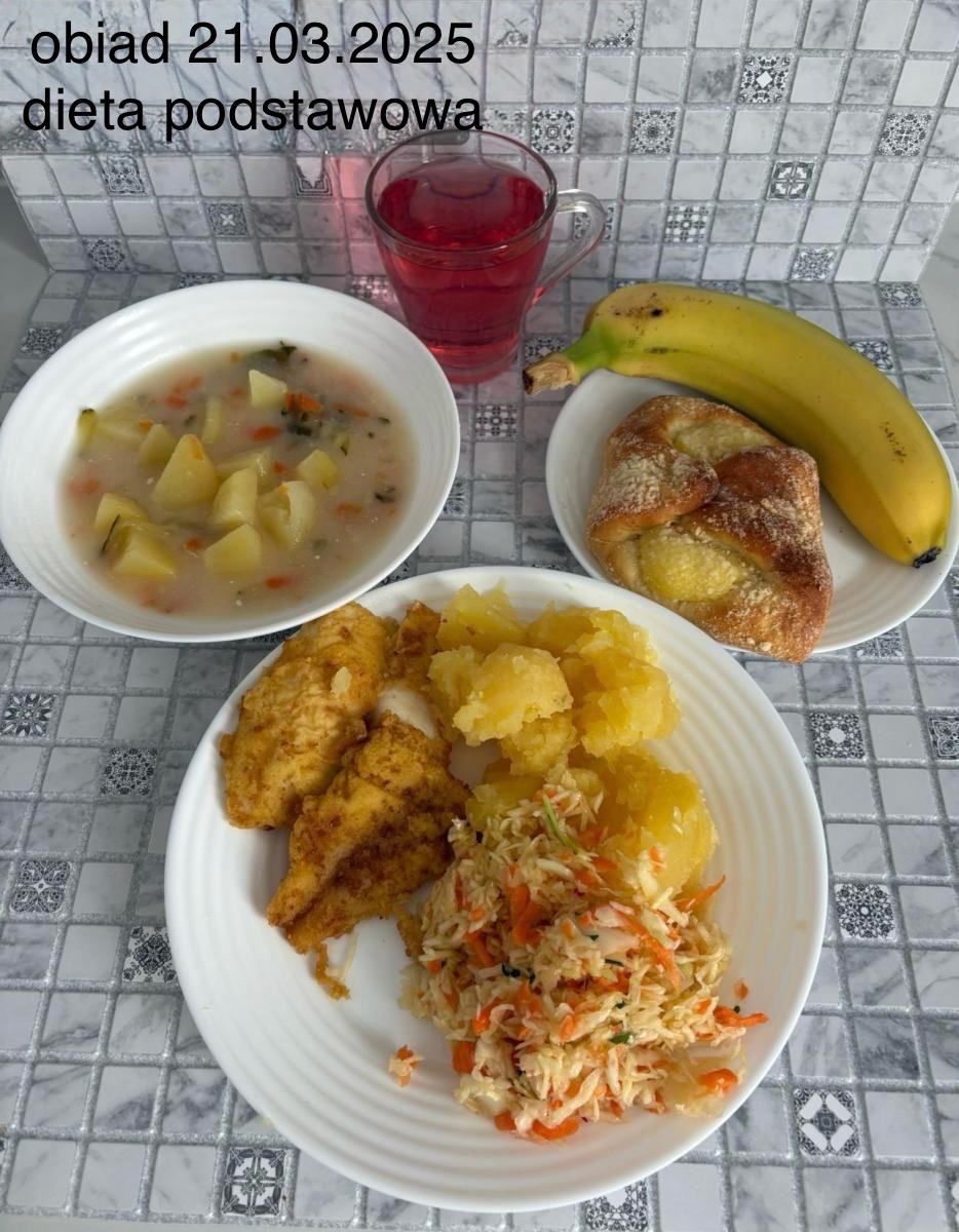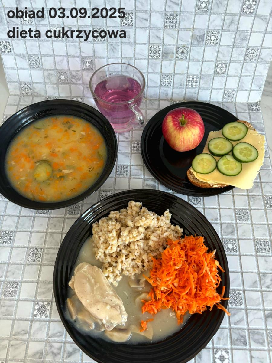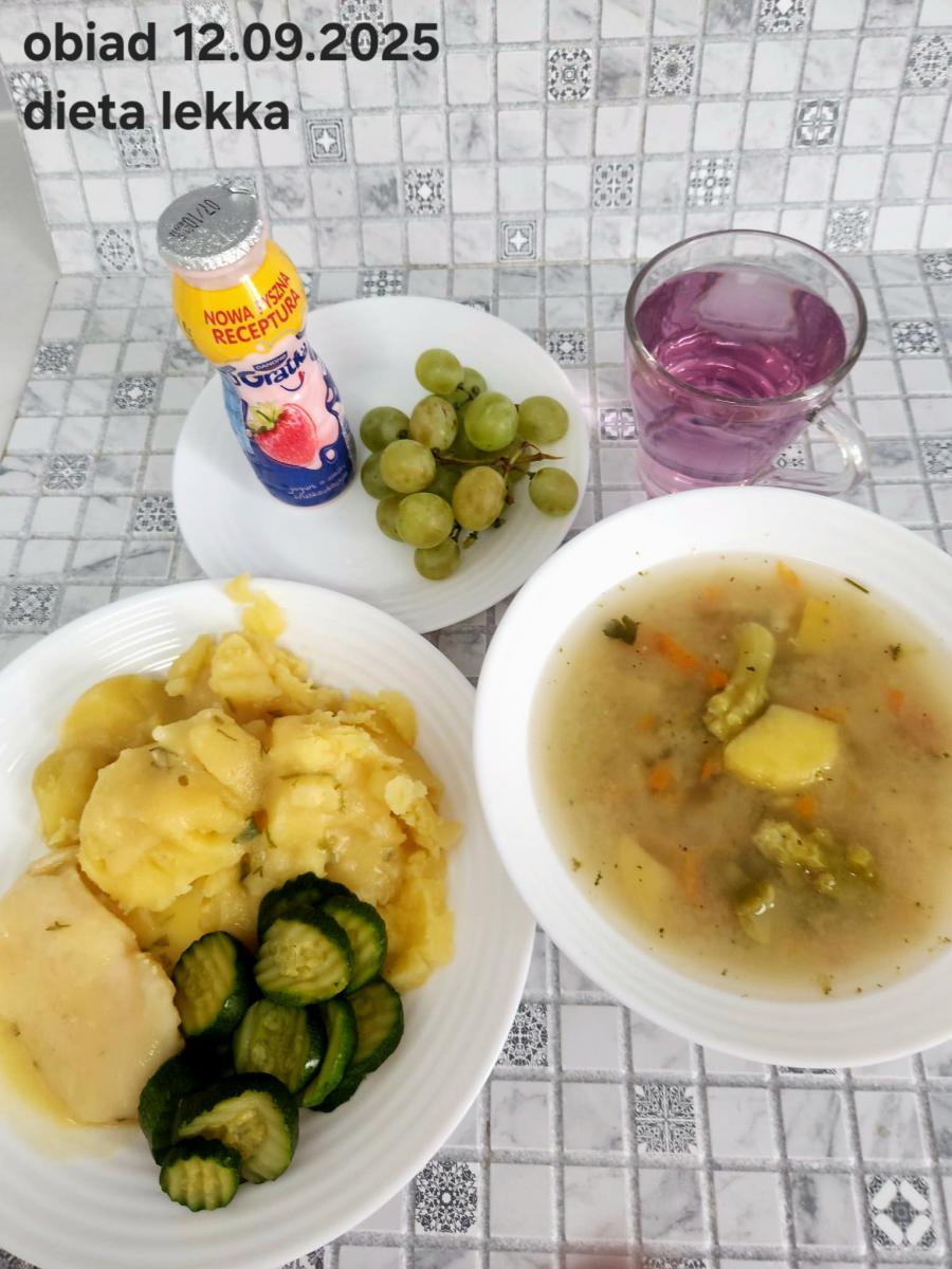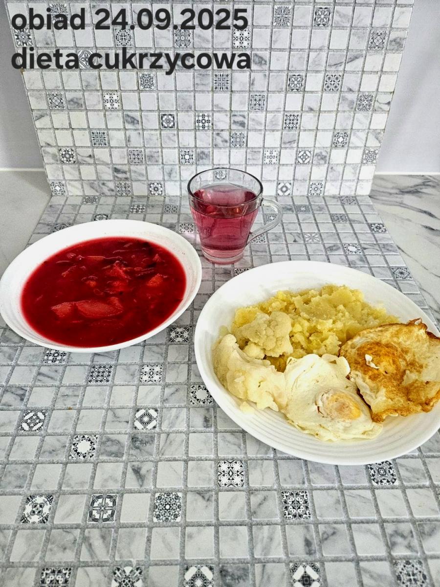 B,ZOL (cały), DZ: Zamiast kaszy- KOPYTKA(ziemniaki, skrobia ziemniaczana, mąka pszenna(1), jaja(3)) (250g), schab podany w formie gulaszu B: barszcz bez śmietany, sos na napoju sojowym (6) (zamiast śmietanki) L, L (W,T) zupa bez dodatku śmietany zamiast kaszy –KOPYTKA(1,3) (250g) Zamiast schabu indyk w wersji lekkostrawnej (filet z indyka- 100g, olej rzepakowy- 10g, papryka- 20g, marchew- pół średniej (22g), koncentrat pomidorowy- łyżeczka (12g), bulion warzywny(9)- 50ml ) L, L(W,T), Z, Z(PD): zamiast surówki brokuły (145g) z dodatkiem oleju rzepakowego (5g) C: Kompot bez dodatku cukru, Barszcz z dodatkiem mąki pełnoziarnistej (1) W: Zamiast surówki brokuły (145g) z dodatkiem oleju rzepakowego (5g) |