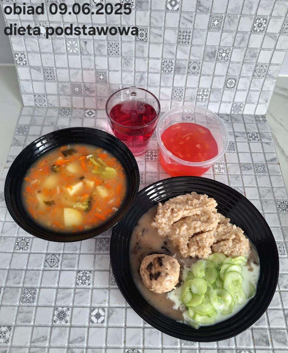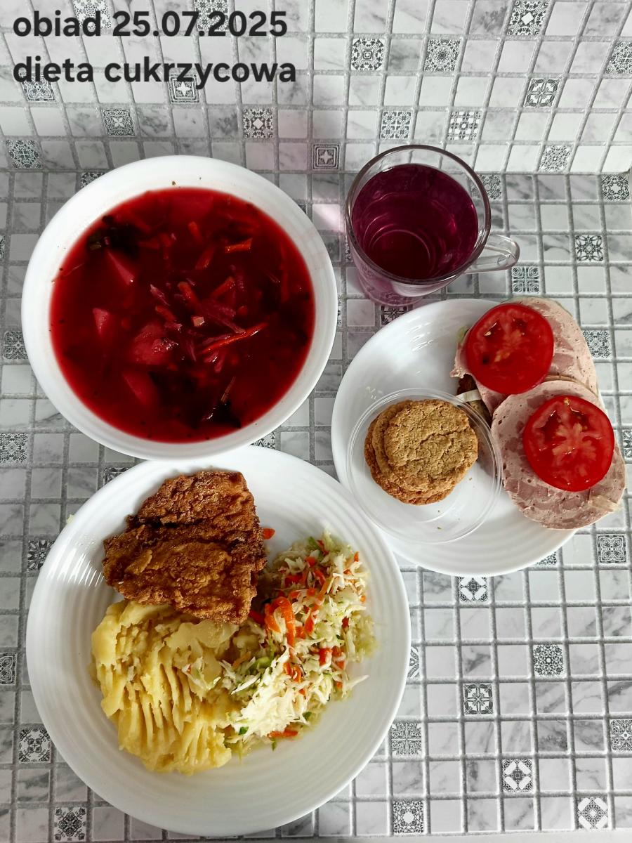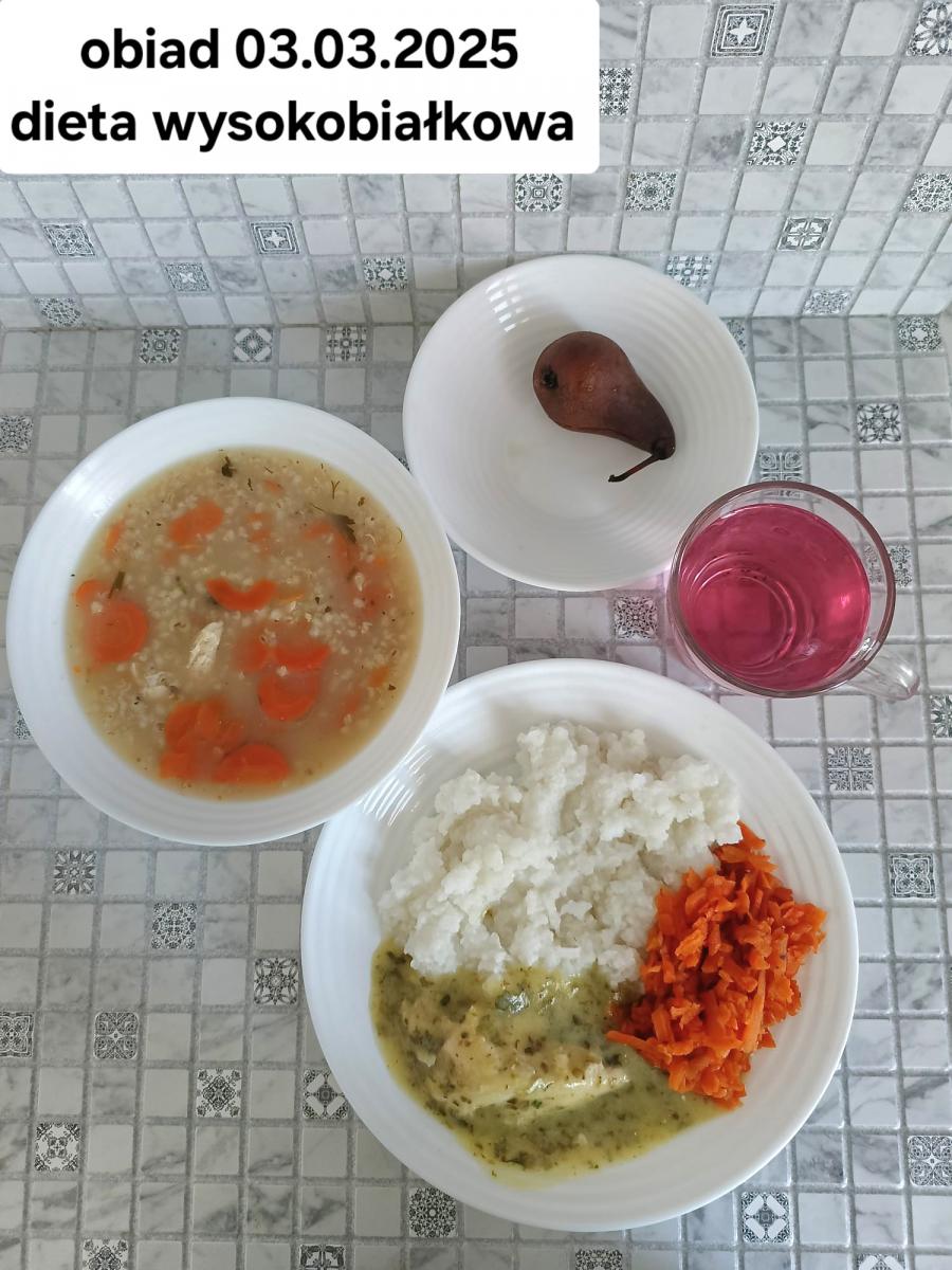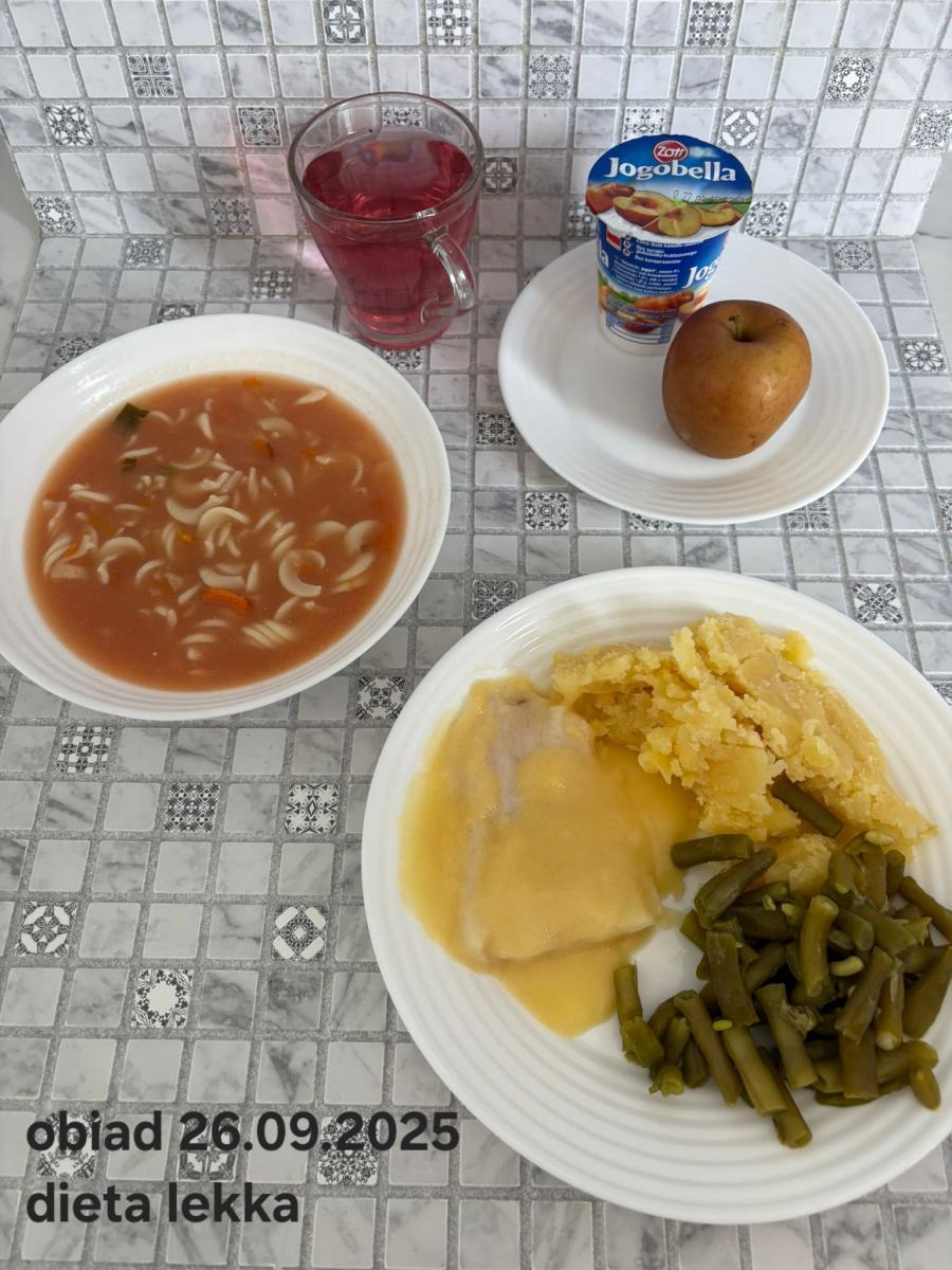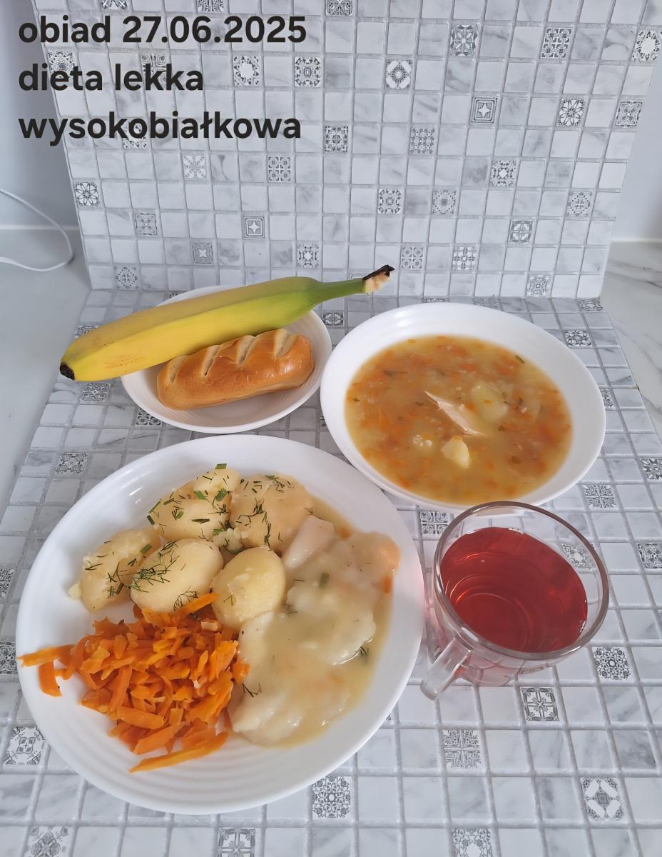 B,ZOL (cały), DZ: Zamiast kaszy- KOPYTKA(ziemniaki, skrobia ziemniaczana, mąka pszenna(1), jaja(3)) (250g), schab podany w formie gulaszu B: barszcz bez śmietany, sos na napoju sojowym (6) (zamiast śmietanki) L, L (W,T) zupa bez dodatku śmietany zamiast kaszy –KOPYTKA(1,3) (250g) Zamiast schabu indyk w wersji lekkostrawnej (filet z indyka- 100g, olej rzepakowy- 10g, papryka- 20g, marchew- pół średniej (22g), koncentrat pomidorowy- łyżeczka (12g), bulion warzywny(9)- 50ml ) L, L(W,T), Z, Z(PD): zamiast surówki brokuły (145g) z dodatkiem oleju rzepakowego (5g) C: Kompot bez dodatku cukru, Barszcz z dodatkiem mąki pełnoziarnistej (1) W: Zamiast surówki brokuły (145g) z dodatkiem oleju rzepakowego (5g) |