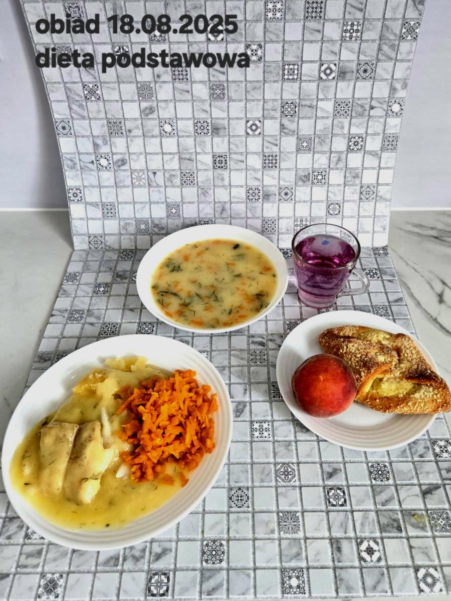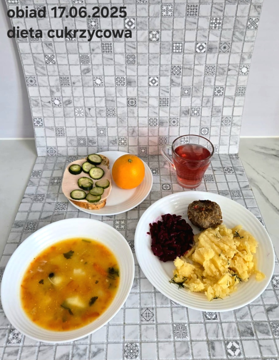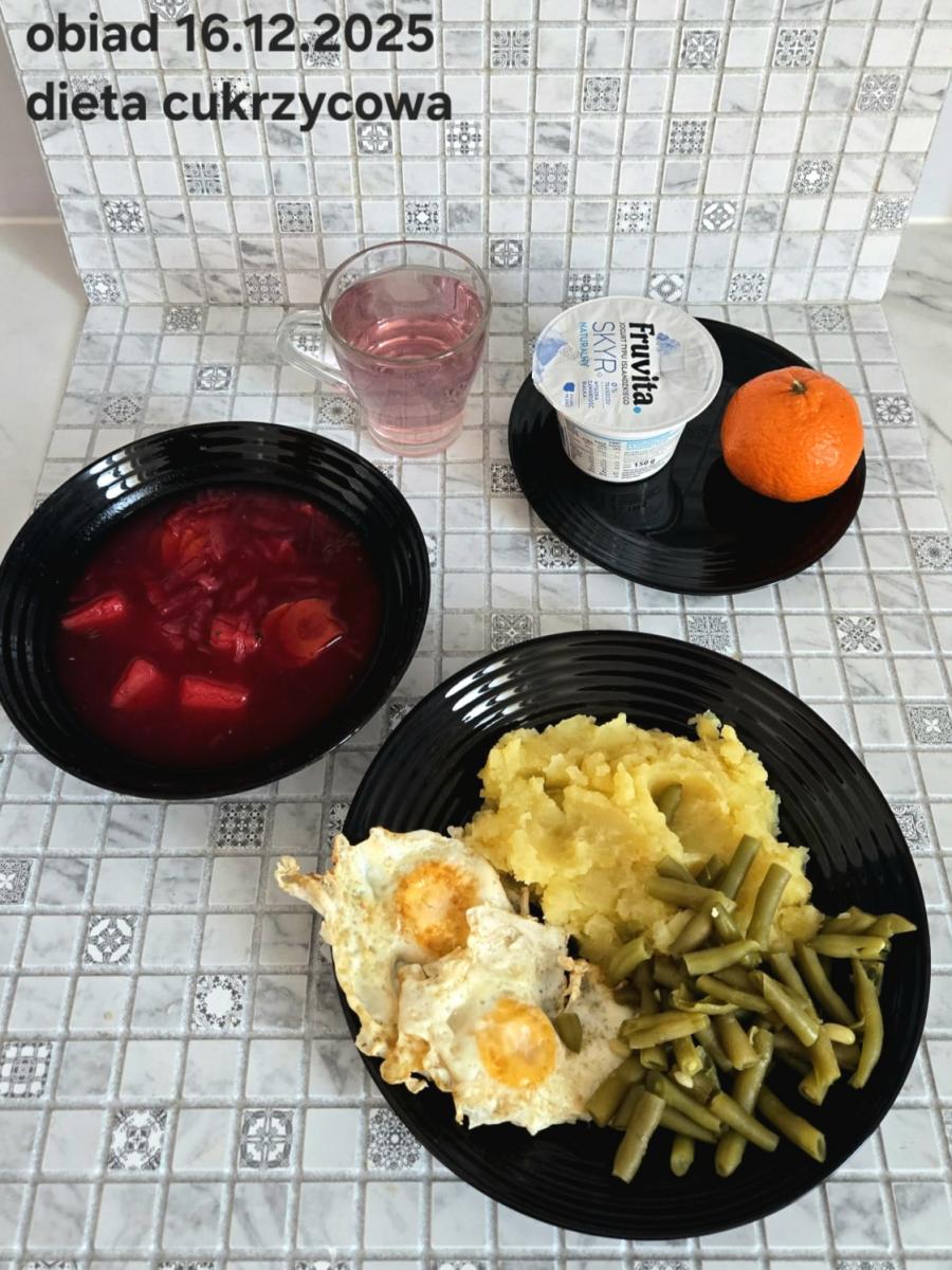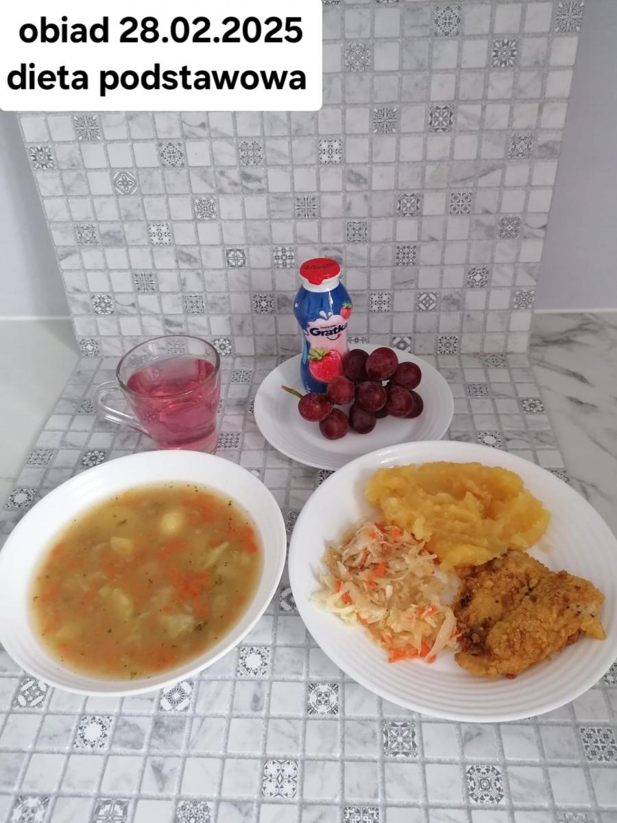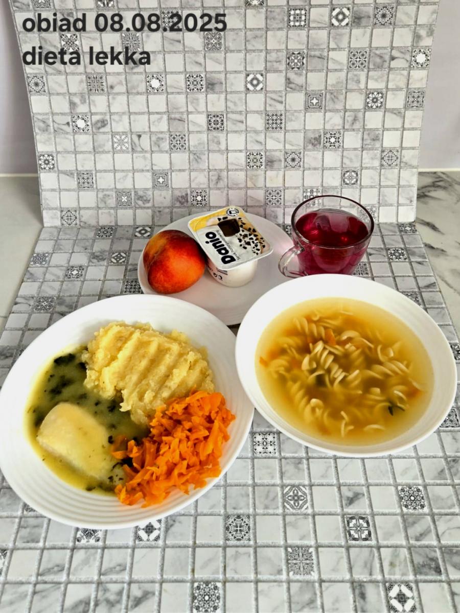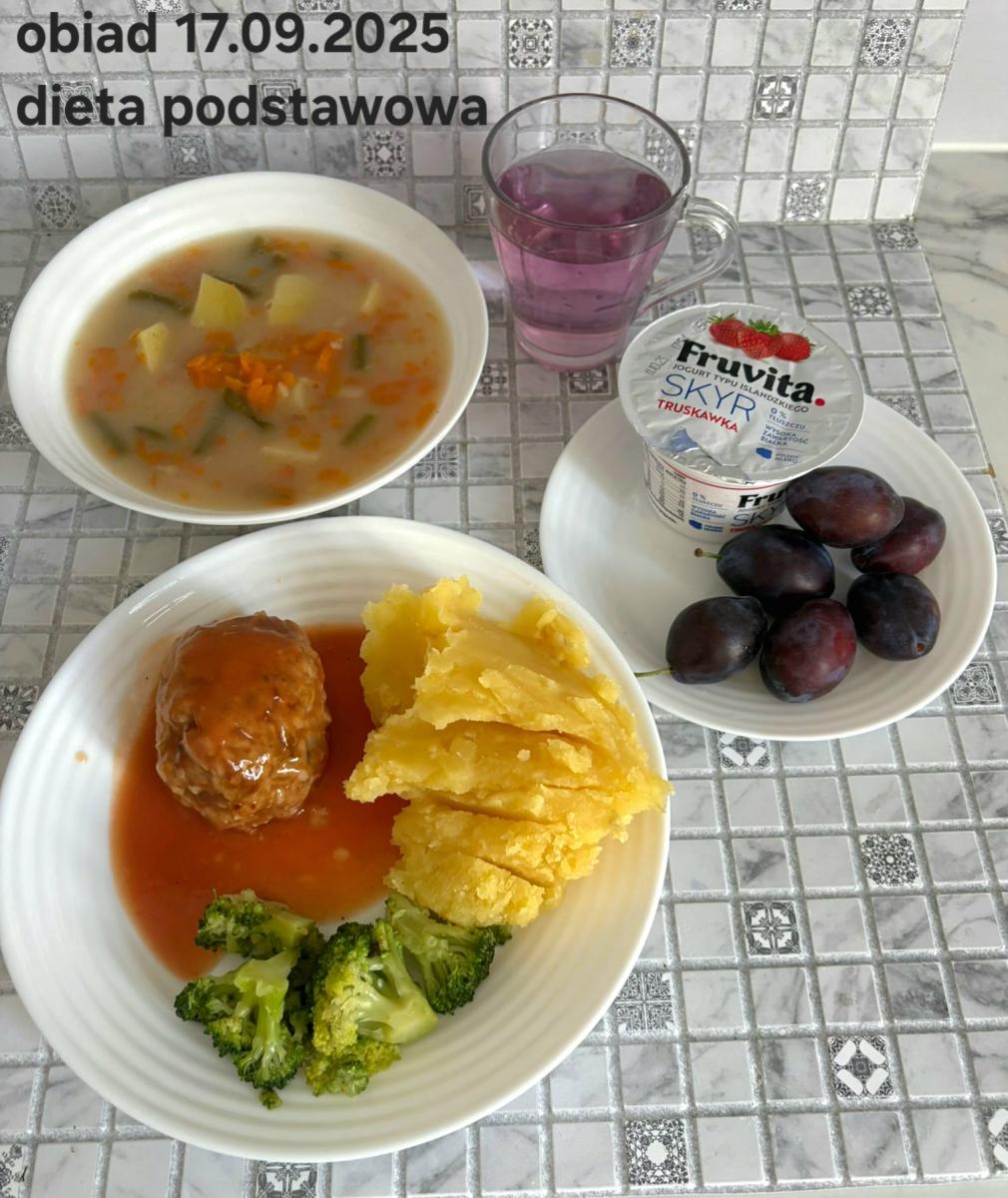 B,ZOL (cały), DZ: Zamiast kaszy- KOPYTKA(ziemniaki, skrobia ziemniaczana, mąka pszenna(1), jaja(3)) (250g), schab podany w formie gulaszu B: barszcz bez śmietany, sos na napoju sojowym (6) (zamiast śmietanki) L, L (W,T) zupa bez dodatku śmietany zamiast kaszy –KOPYTKA(1,3) (250g) Zamiast schabu indyk w wersji lekkostrawnej (filet z indyka- 100g, olej rzepakowy- 10g, papryka- 20g, marchew- pół średniej (22g), koncentrat pomidorowy- łyżeczka (12g), bulion warzywny(9)- 50ml ) L, L(W,T), Z, Z(PD): zamiast surówki brokuły (145g) z dodatkiem oleju rzepakowego (5g) C: Kompot bez dodatku cukru, Barszcz z dodatkiem mąki pełnoziarnistej (1) W: Zamiast surówki brokuły (145g) z dodatkiem oleju rzepakowego (5g) |