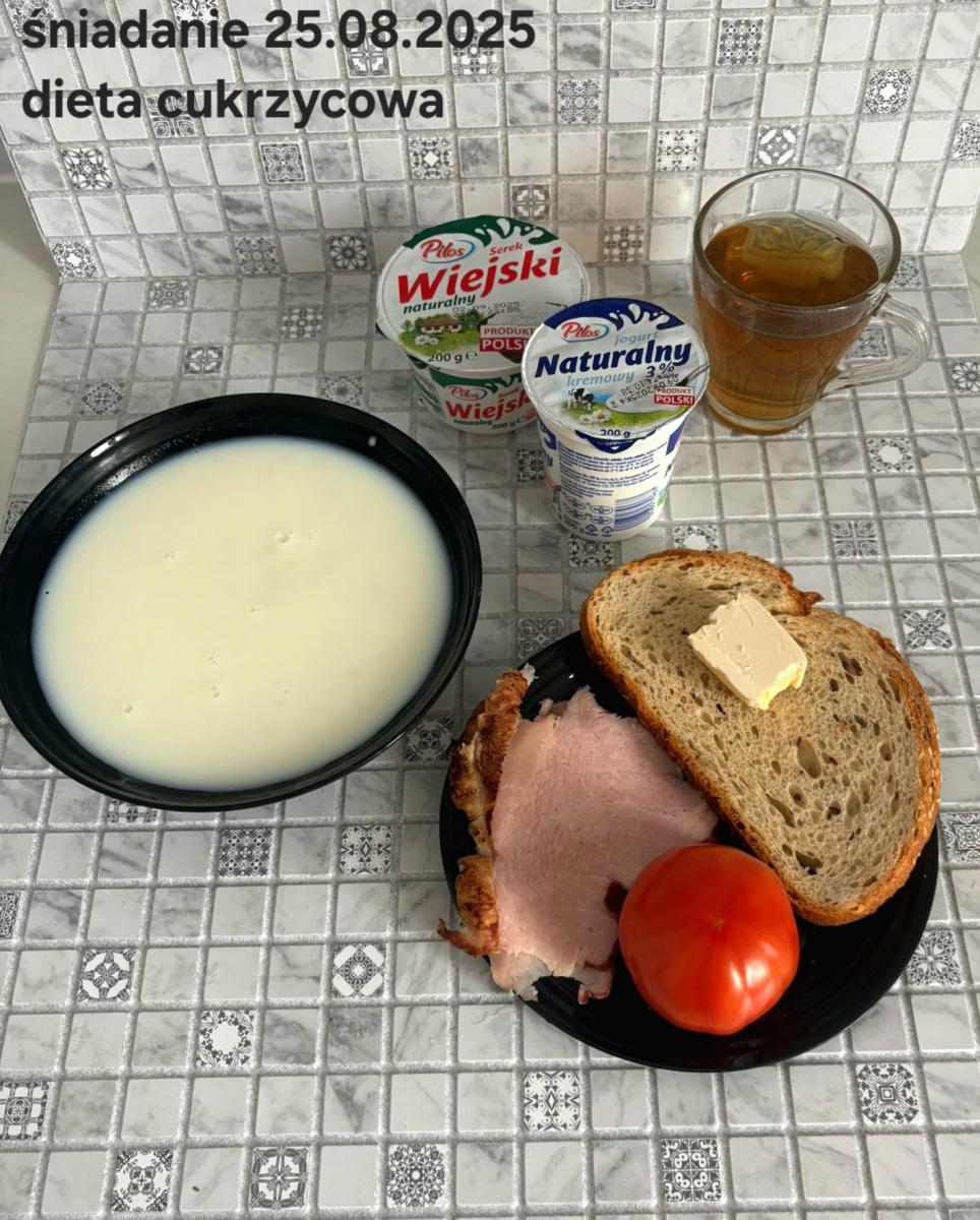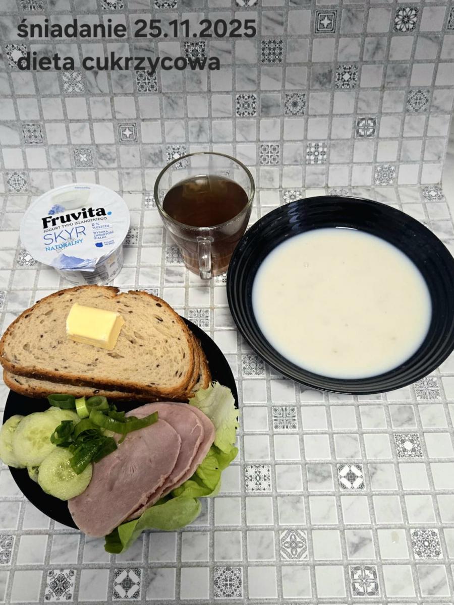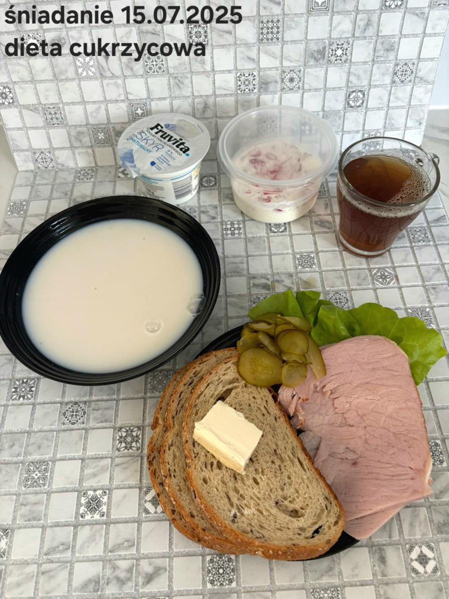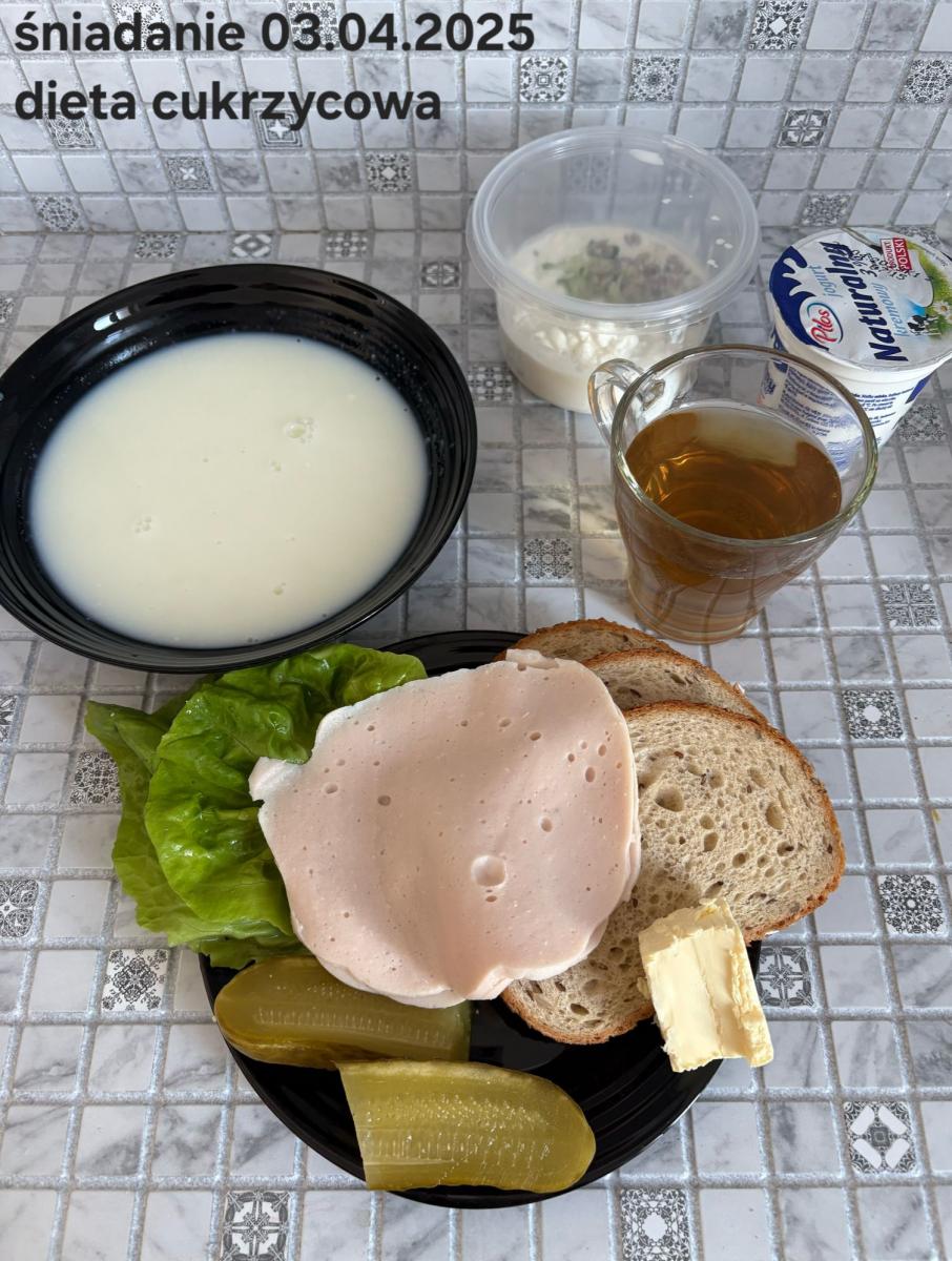 C: Zupa mleczna z ryżem brązowym (45g), chleb żytni razowy(1)- 150g herbata bez cukru W: dodatkowe 25g szynki drobiowej |