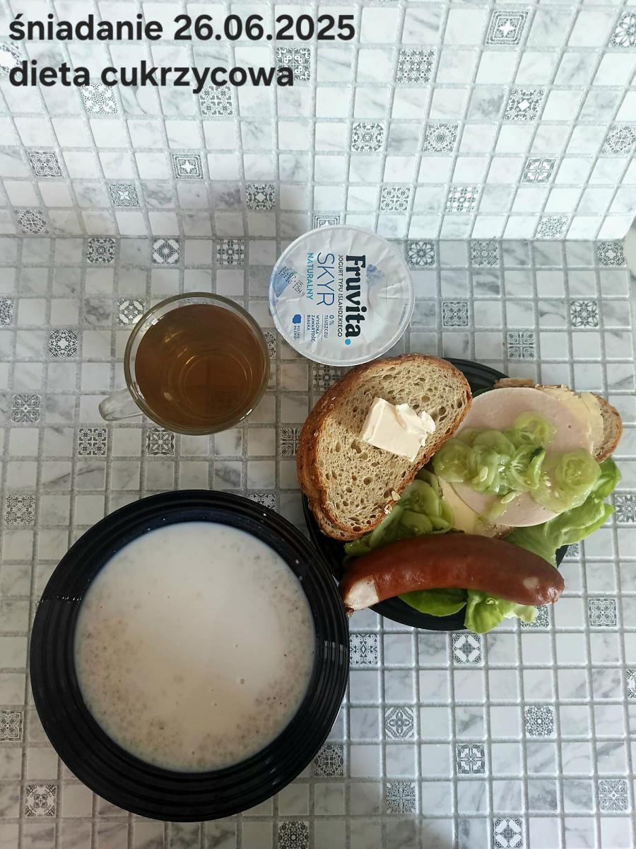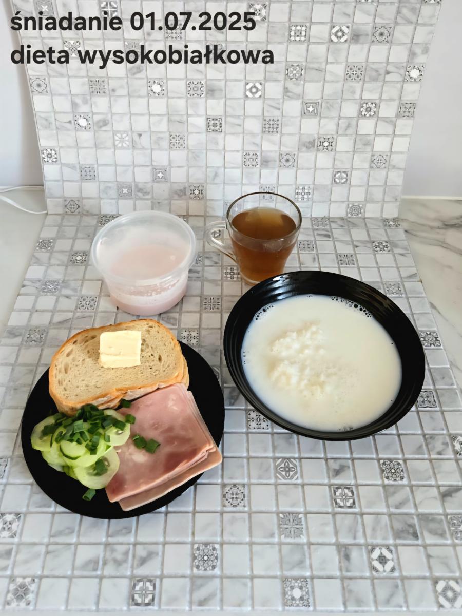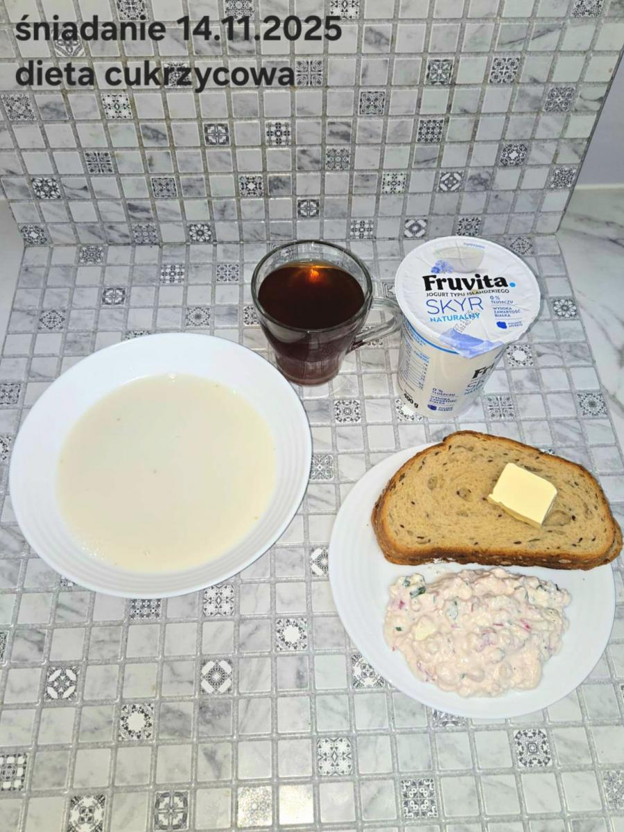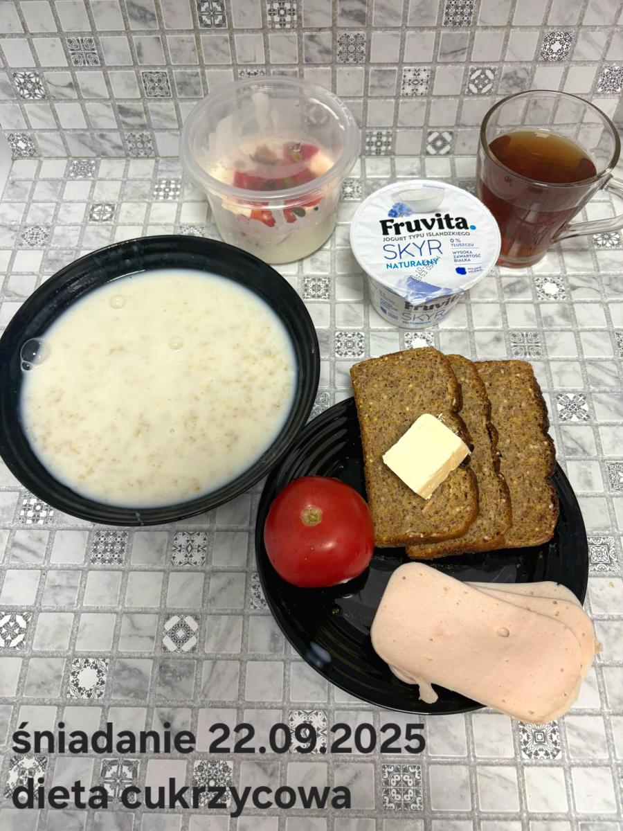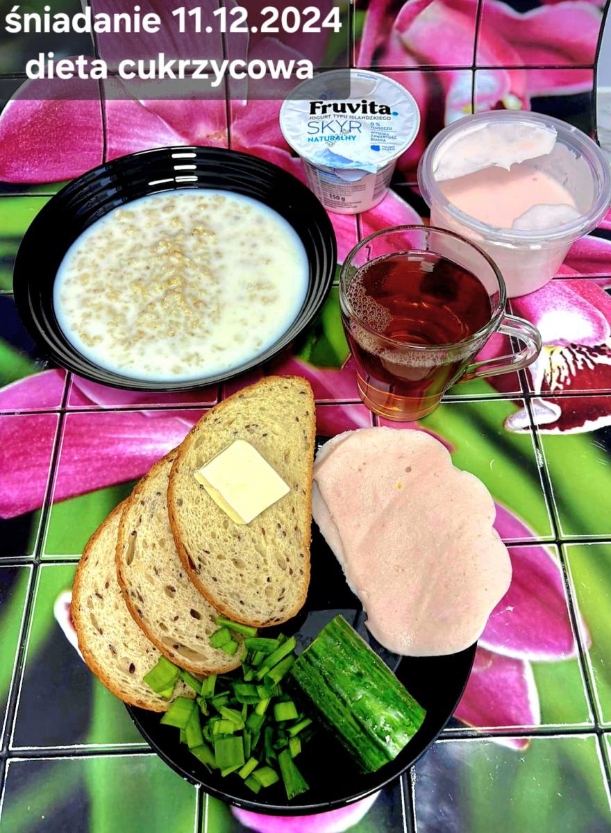 C: Zupa mleczna z ryżem brązowym (45g), chleb żytni razowy(1)- 150g herbata bez cukru W: dodatkowe 25g szynki drobiowej |