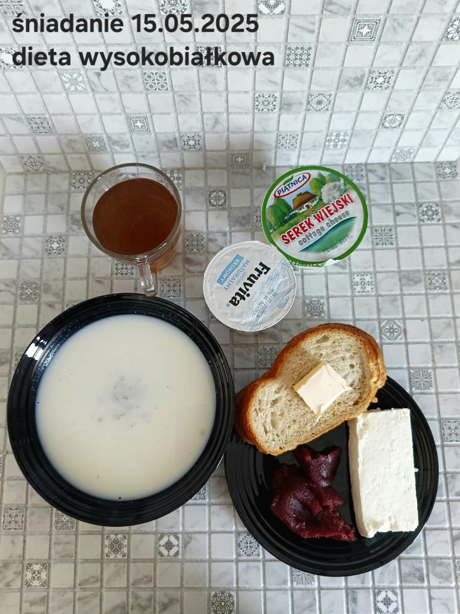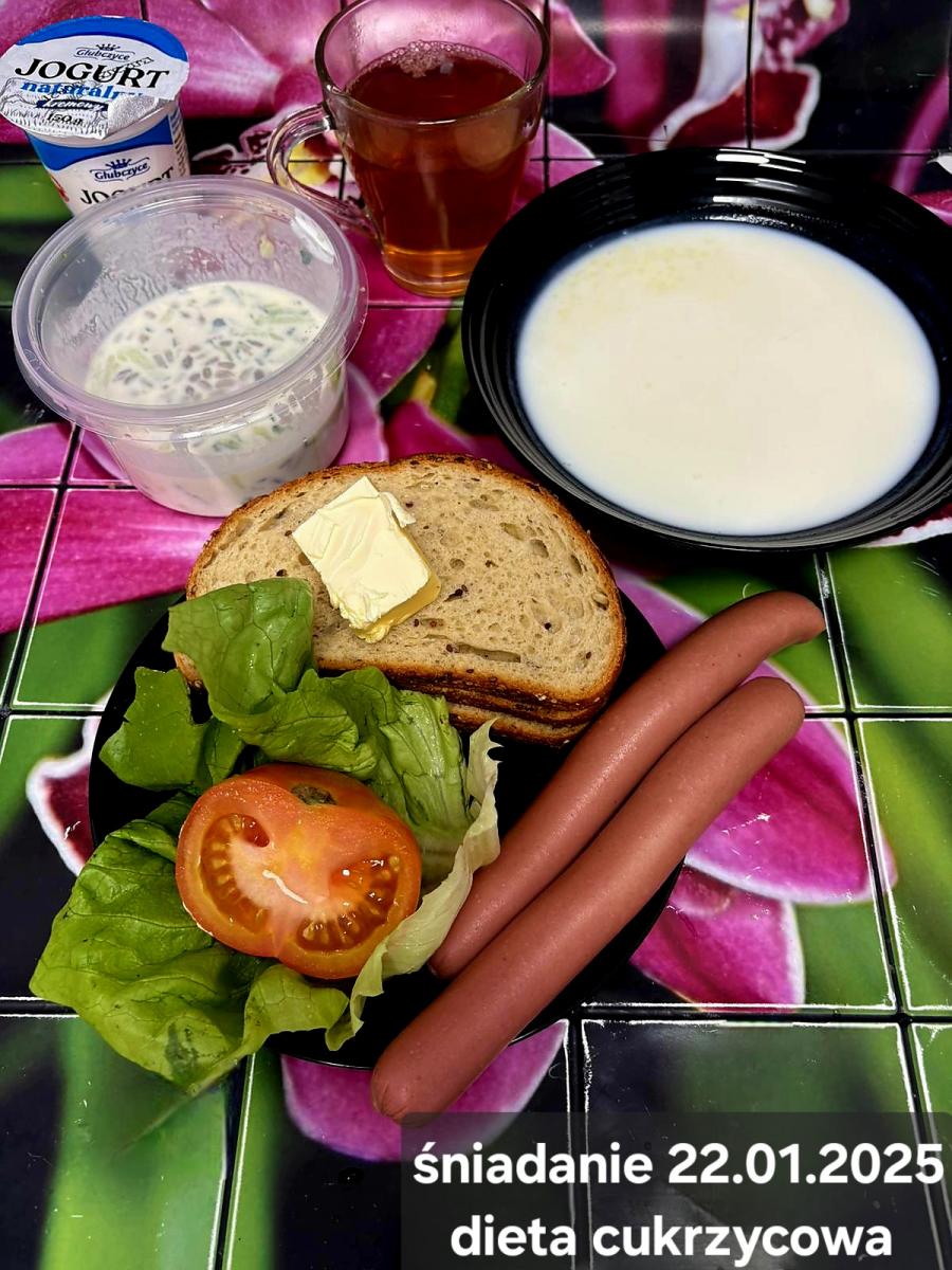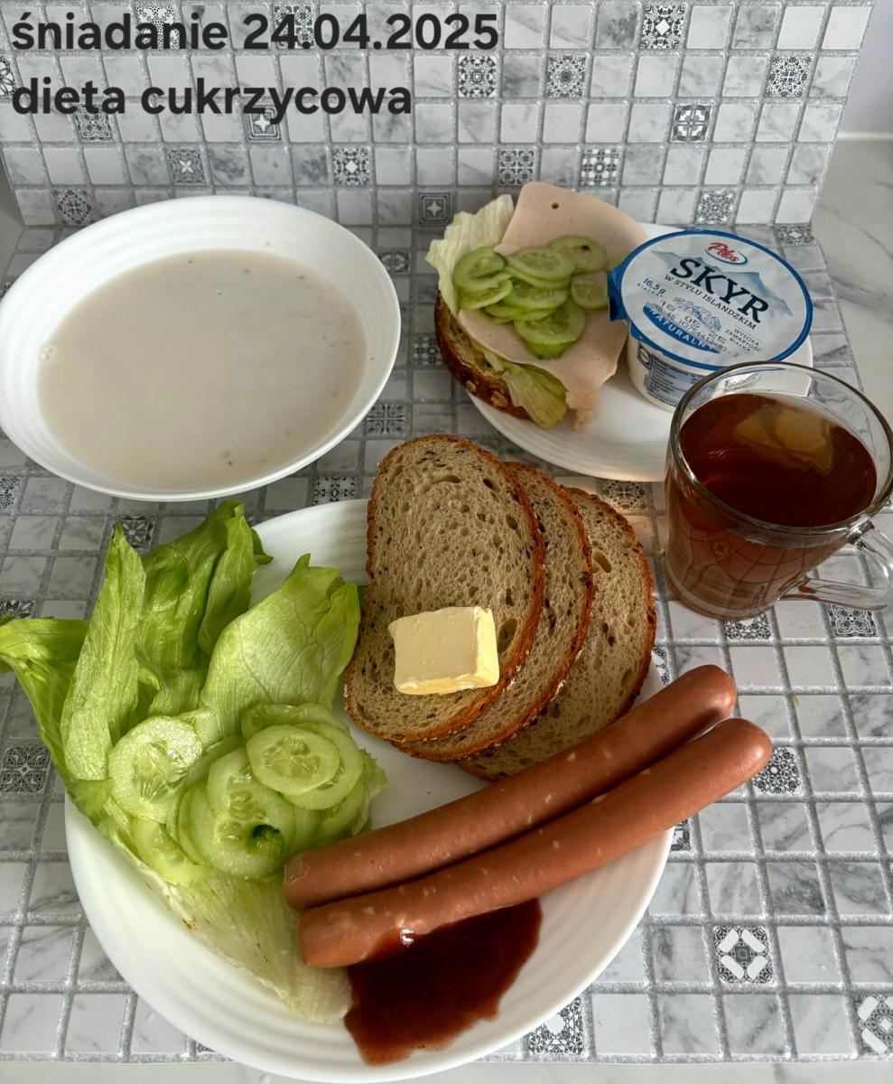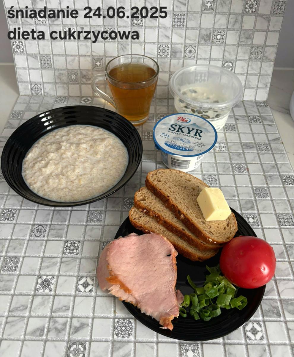 C: Zupa mleczna z ryżem brązowym (45g), chleb żytni razowy(1)- 150g herbata bez cukru W: dodatkowe 25g szynki drobiowej |