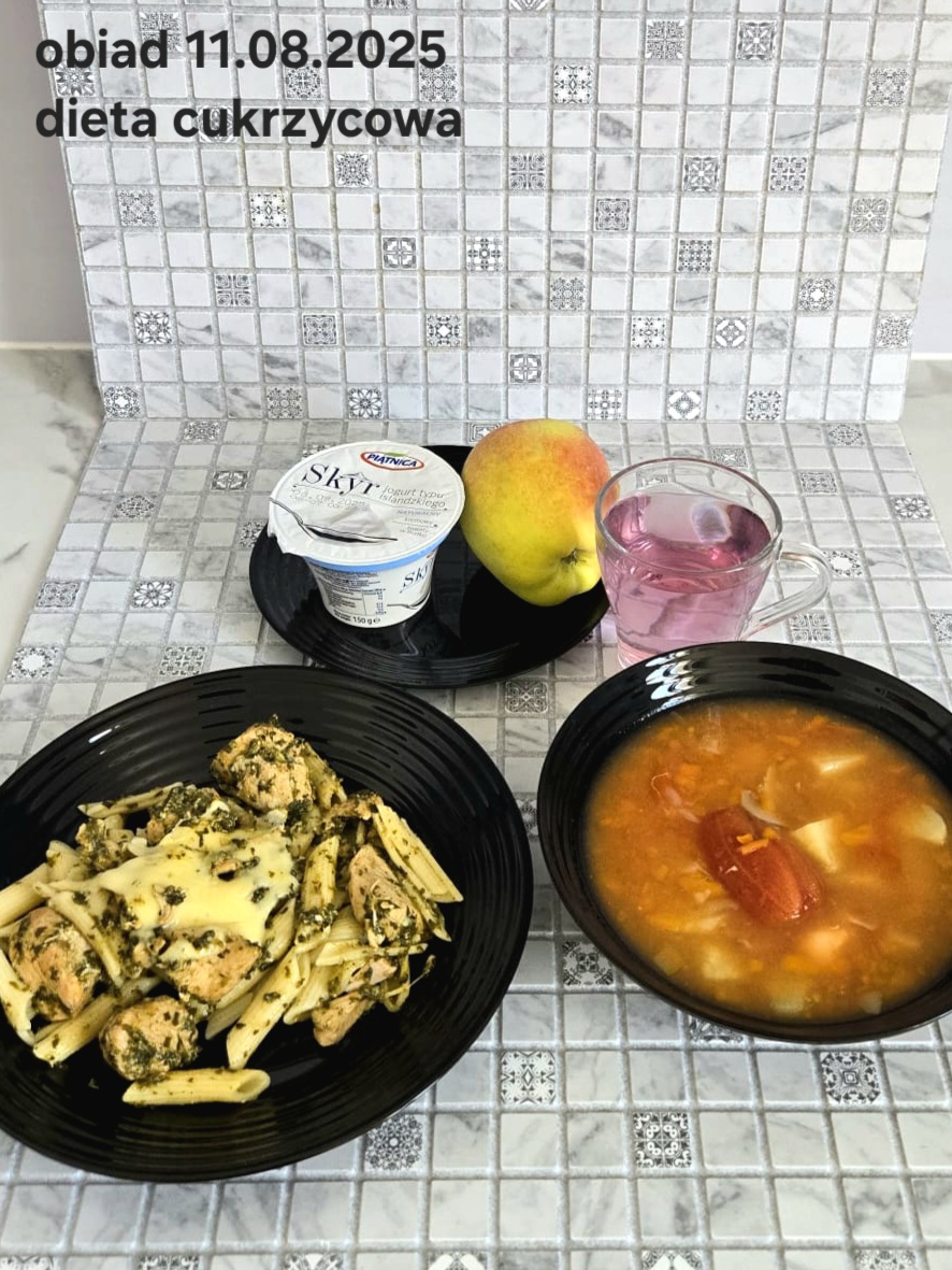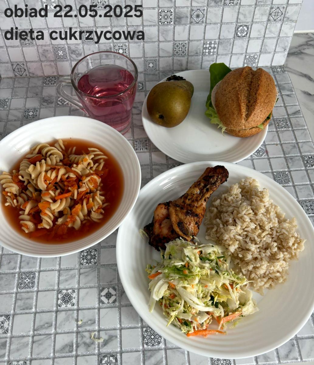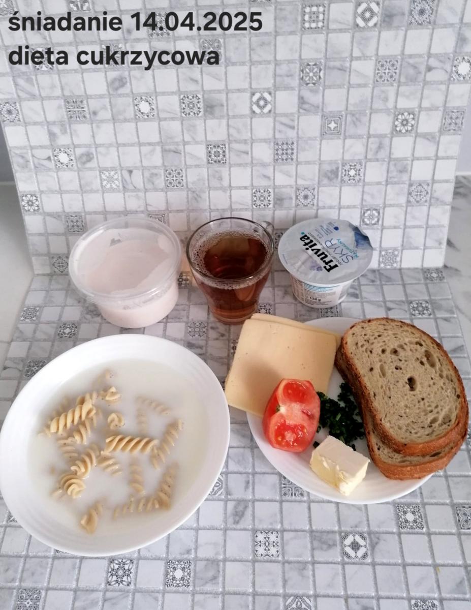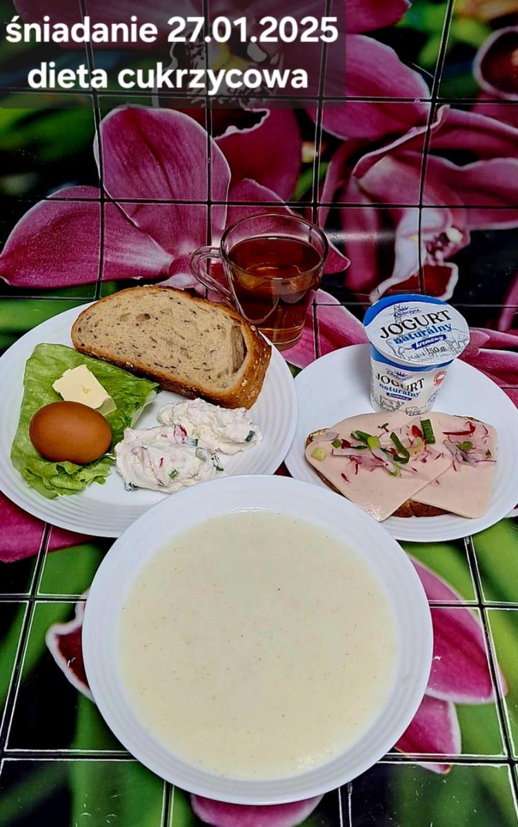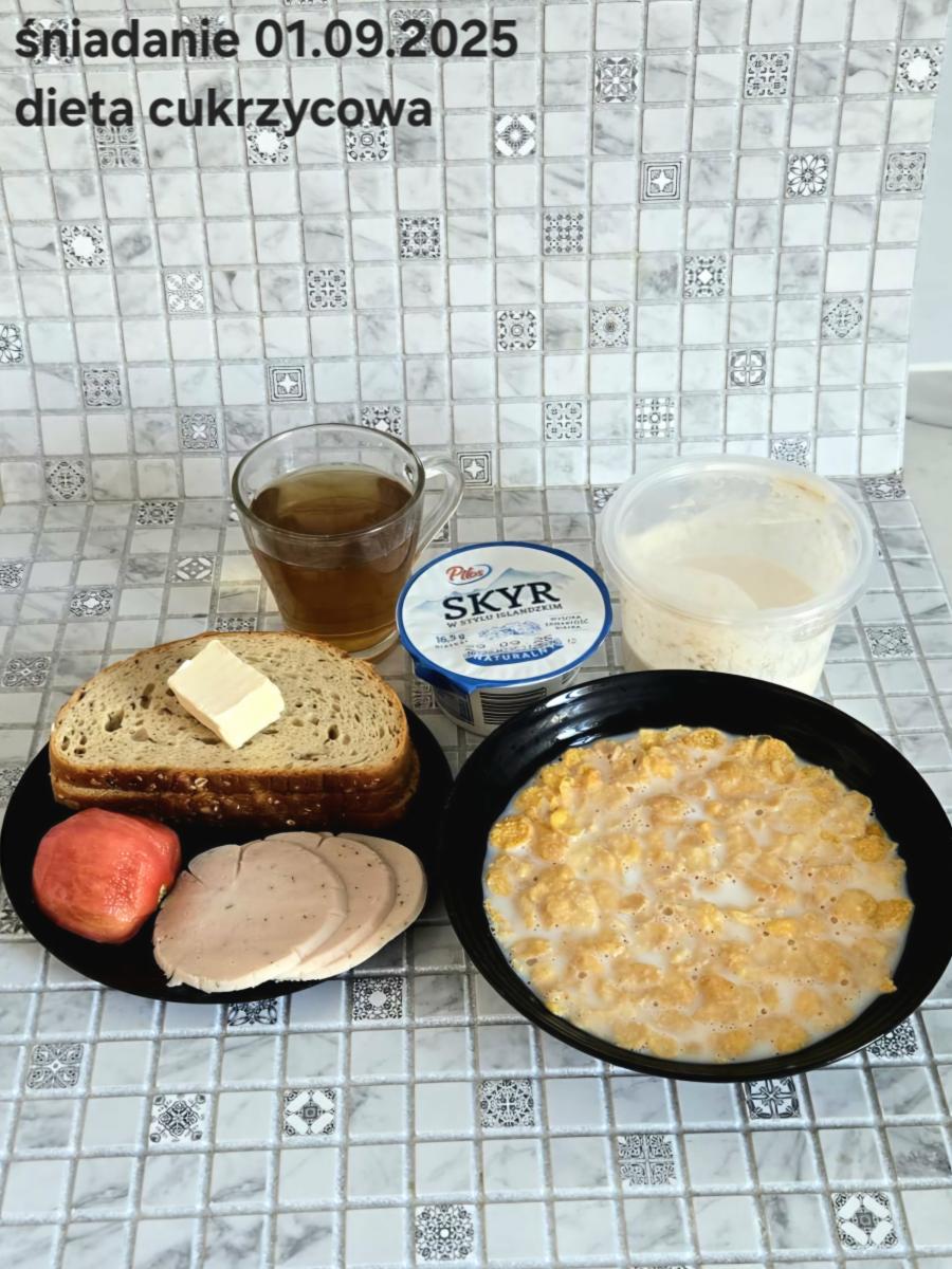 C: Zupa mleczna z ryżem brązowym (45g), chleb żytni razowy(1)- 150g herbata bez cukru W: dodatkowe 25g szynki drobiowej |