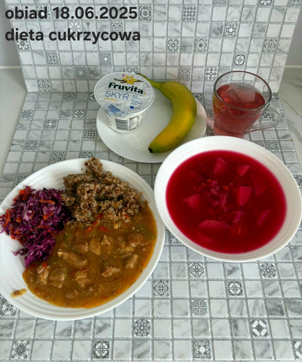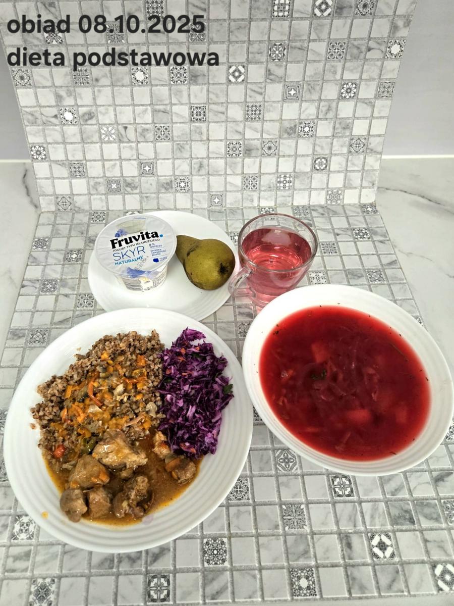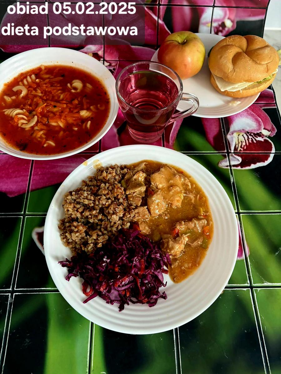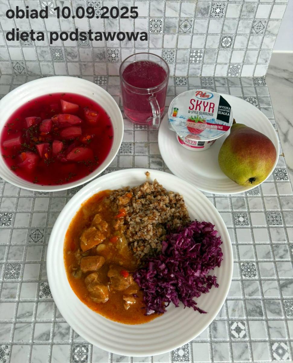 Barszcz czerwony (składniki: wywar mięsny drobiowy(9)- 150ml, burak- 100g, ziemniaki-90g, marchew-15g, seler (9)-15g, pietruszka-15g, , śmietana18% (7)- 10g, mąka pszenna (1)- 5g, majeranek, sól, pieprz) Gulasz w sosie warzywnym z kaszą gryczaną (250g) i surówką z kapusty czerwonej (150g) (schab- 80g, papryka czerwona- 20g, papryka żółta- 20g, cebula- 10g, olej rzepakowy- łyżka- 10g, przecier pomidorowy- 50g, pieczarki 2 x 20g, kasza gryczana, kapusta, jabłko, marchew, natka pietruszki, jogurt(7), majonez(3,10), cukier) Kompot jabłkowy - 250ml
