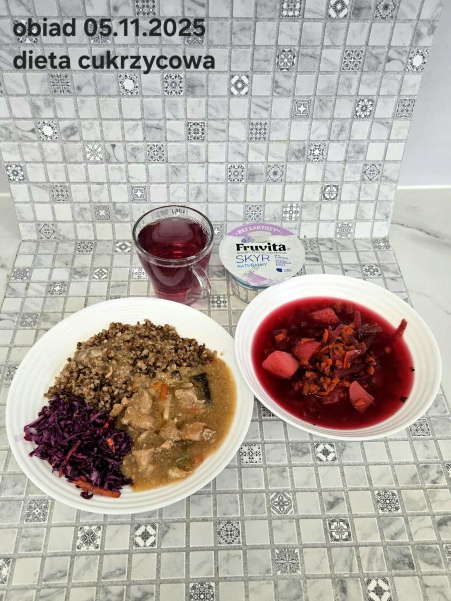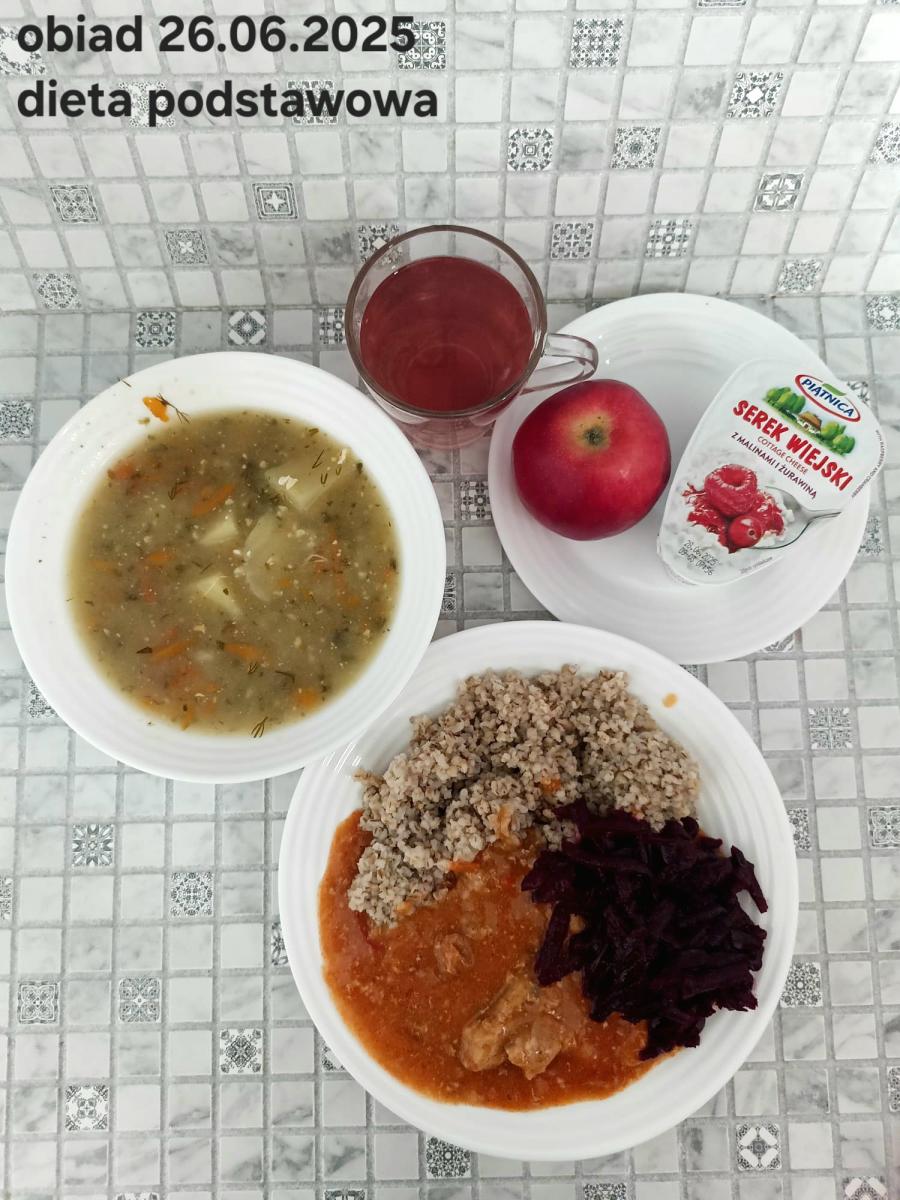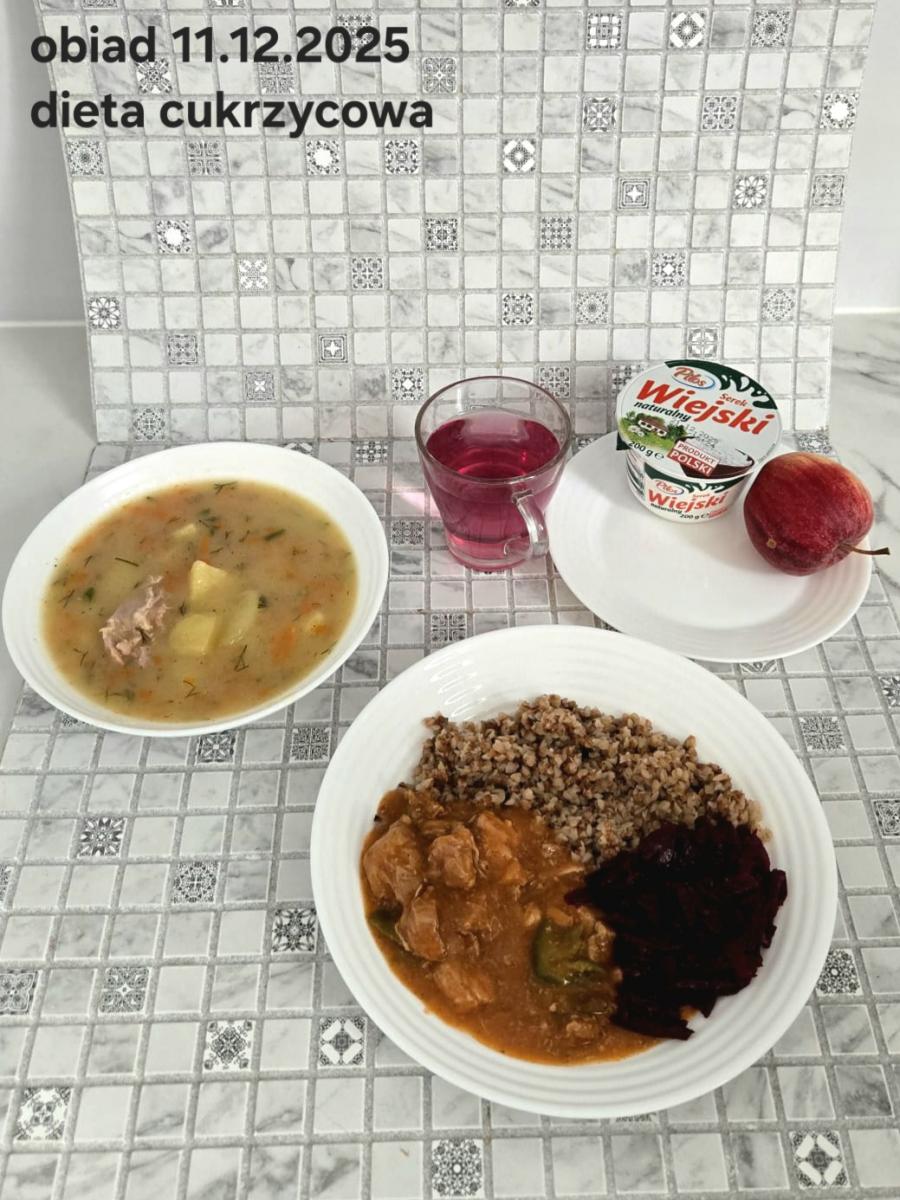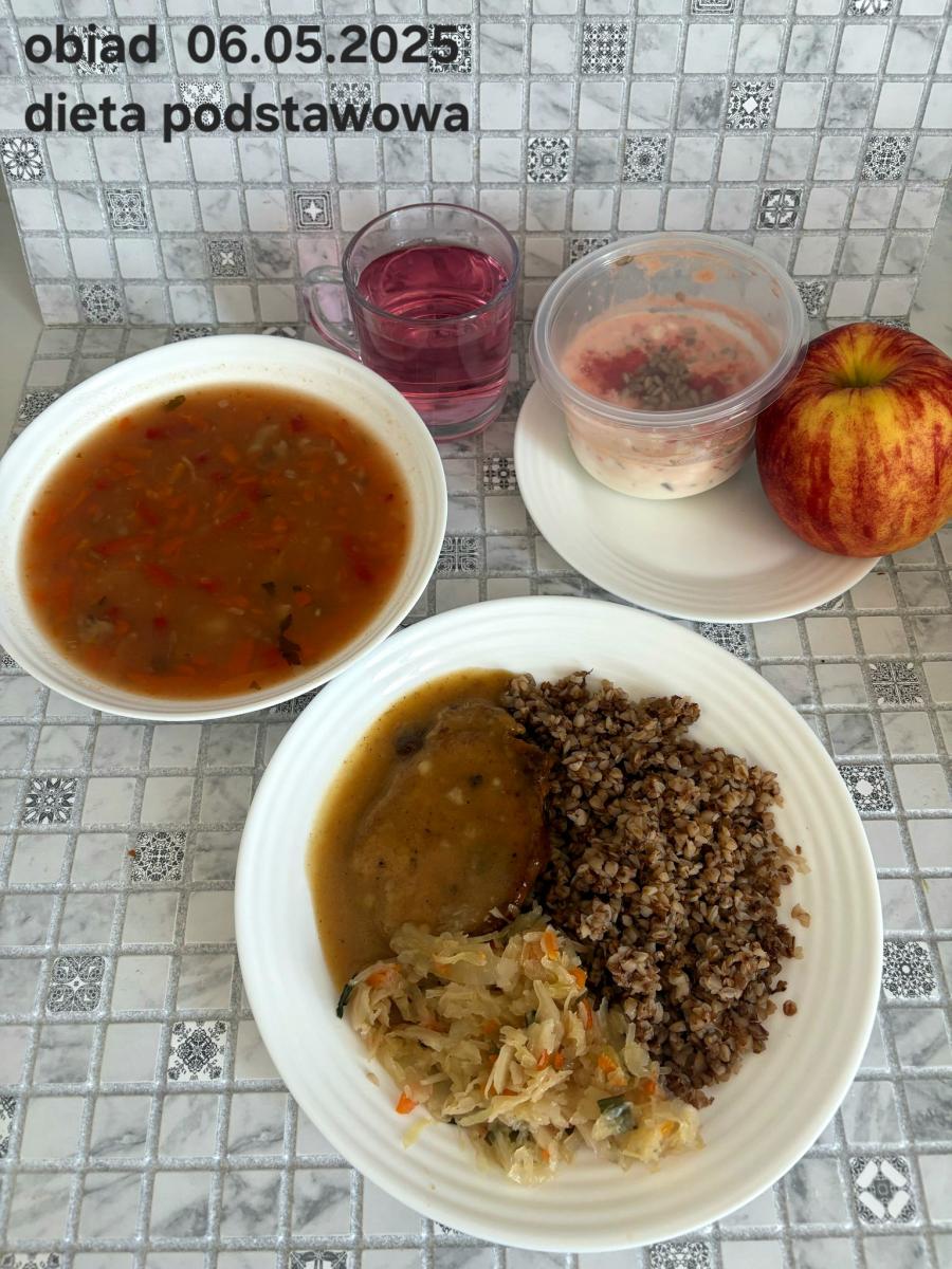 Barszcz czerwony (składniki: wywar mięsny drobiowy(9)- 150ml, burak- 100g, ziemniaki-90g, marchew-15g, seler (9)-15g, pietruszka-15g, , śmietana18% (7)- 10g, mąka pszenna (1)- 5g, majeranek, sól, pieprz) Gulasz w sosie warzywnym z kaszą gryczaną (250g) i surówką z kapusty czerwonej (150g) (schab- 80g, papryka czerwona- 20g, papryka żółta- 20g, cebula- 10g, olej rzepakowy- łyżka- 10g, przecier pomidorowy- 50g, pieczarki 2 x 20g, kasza gryczana, kapusta, jabłko, marchew, natka pietruszki, jogurt(7), majonez(3,10), cukier) Kompot jabłkowy - 250ml