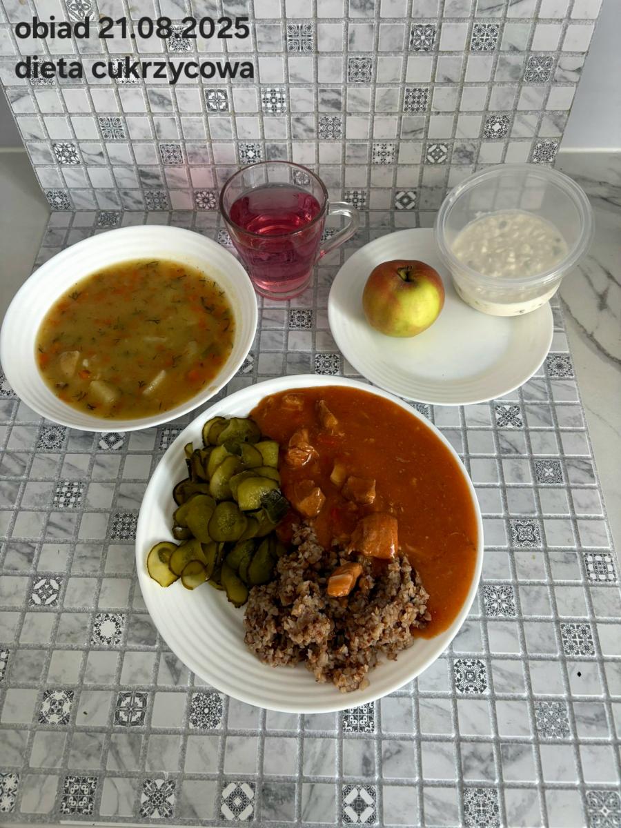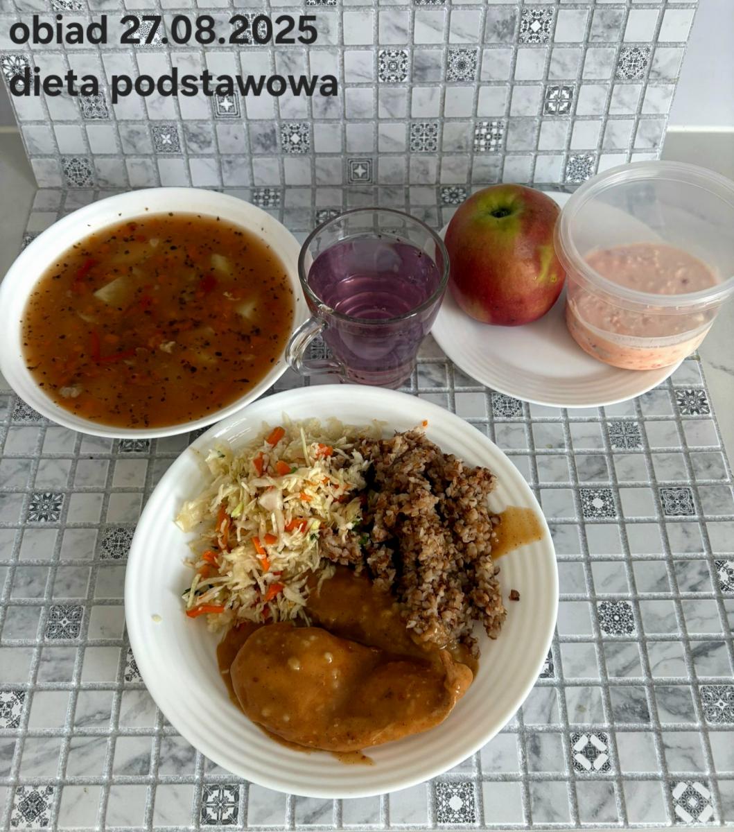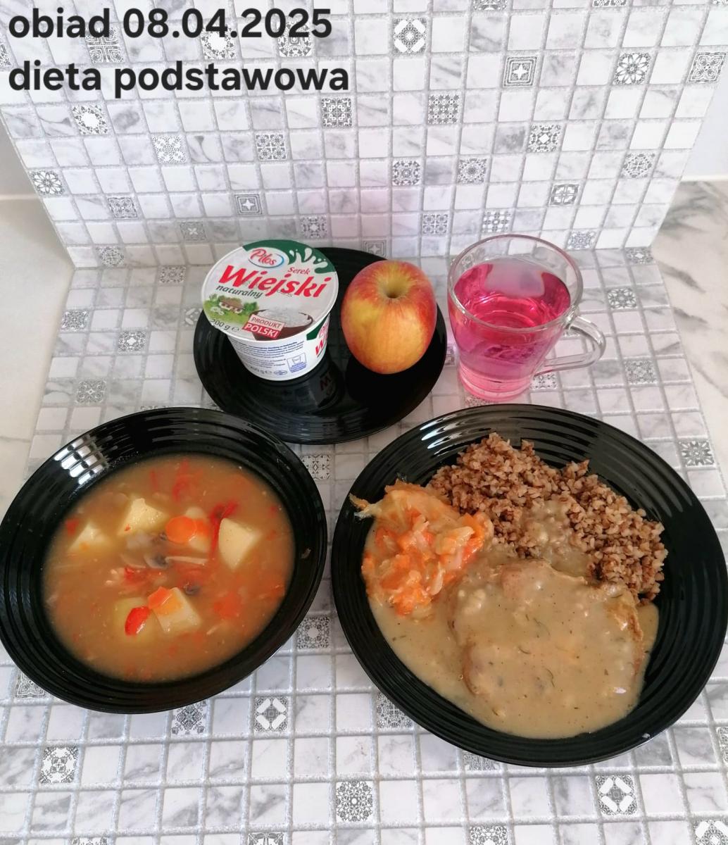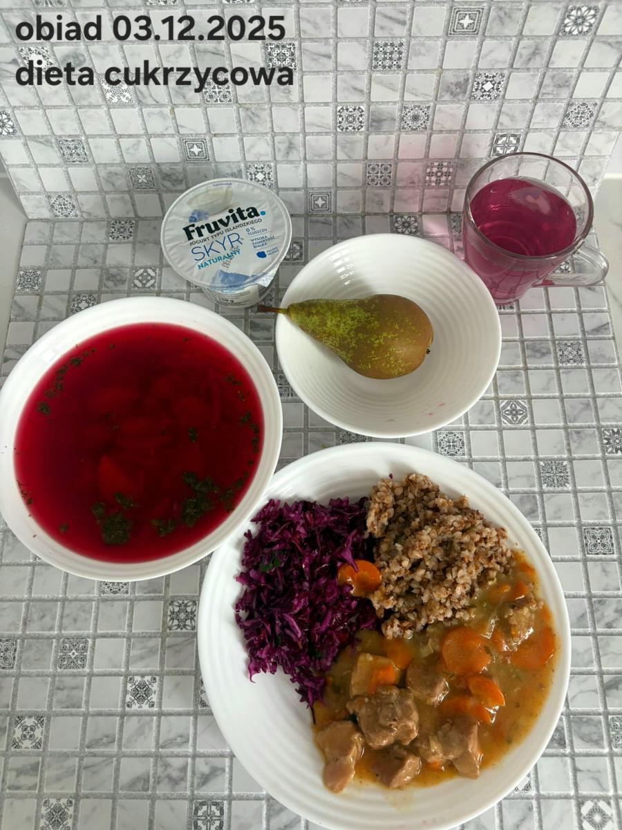 Barszcz czerwony (składniki: wywar mięsny drobiowy(9)- 150ml, burak- 100g, ziemniaki-90g, marchew-15g, seler (9)-15g, pietruszka-15g, , śmietana18% (7)- 10g, mąka pszenna (1)- 5g, majeranek, sól, pieprz) Gulasz w sosie warzywnym z kaszą gryczaną (250g) i surówką z kapusty czerwonej (150g) (schab- 80g, papryka czerwona- 20g, papryka żółta- 20g, cebula- 10g, olej rzepakowy- łyżka- 10g, przecier pomidorowy- 50g, pieczarki 2 x 20g, kasza gryczana, kapusta, jabłko, marchew, natka pietruszki, jogurt(7), majonez(3,10), cukier) Kompot jabłkowy - 250ml