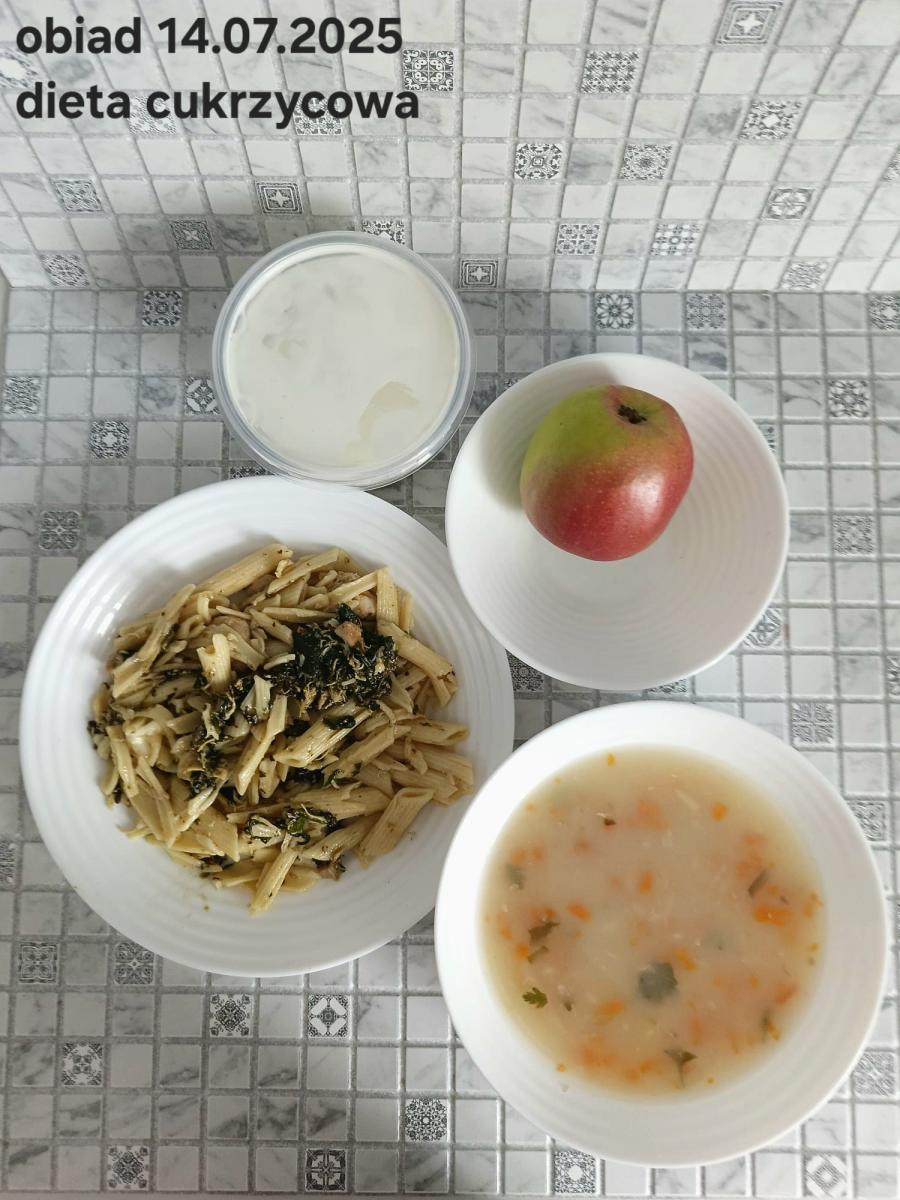 Lekka zupa gulaszowa- porcja (400g) (pierś z kurczaka, pieczarki, cebula, papryka, ziemniaki, natka pietruszki, oliwa, czosnek, koncentrat pomidorowy) Makaron penne ze szpinakiem, czosnkiem, pomidorem i mozzarellą makaron penne (1)- 150g, pierś z kurczaka- 100g, szpinak- 100g, pomidor- ¼ średniego (45g), olej rzepakowy- 10g, czosnek- ząbek (5g), mozzarella (7)- 30g, mleko 1,5% (7)- 50ml, mąka pszenna (1)- 8g, żółtko (3) – 8g