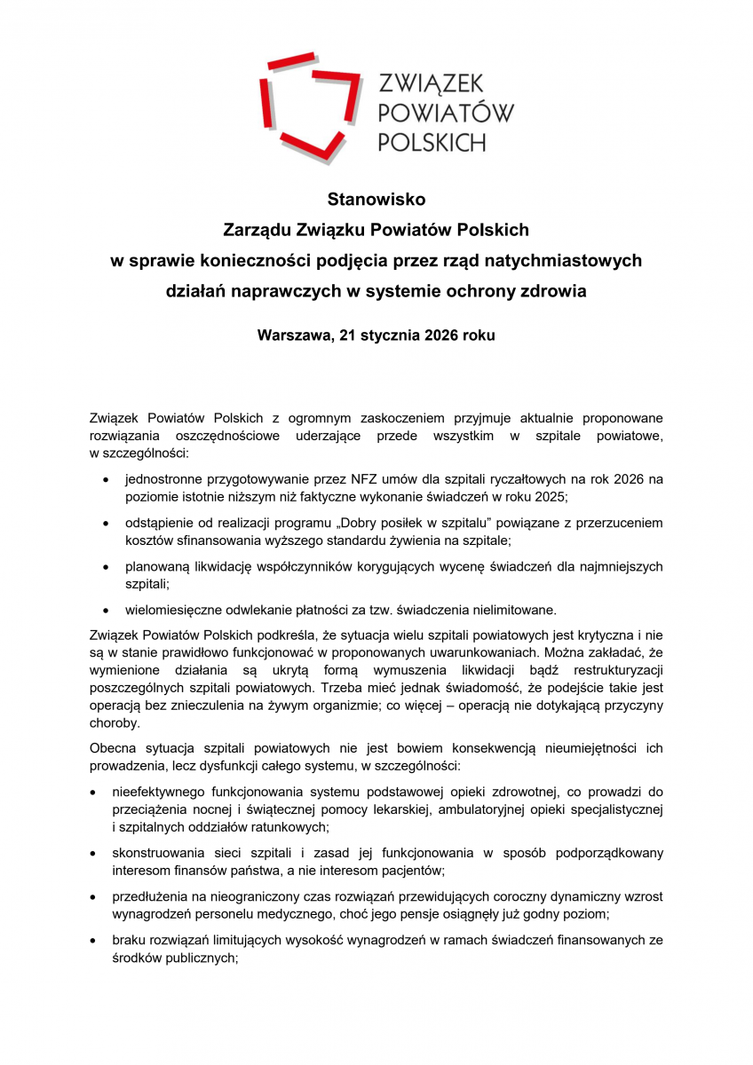 Stanowisko ZPP w sprawie konieczności podjęcia przez rząd natychmiastowych działań naprawczych w systemie ochrony zdrowia.