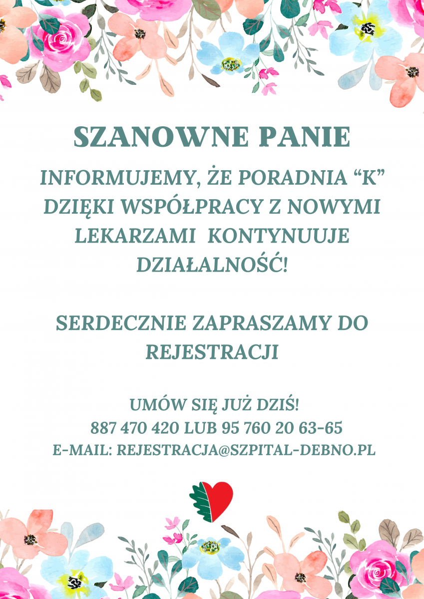SZANOWNE PANIE INFORMUJEMY, ŻE PORADNIA “K” DZIĘKI WSPÓŁPRACY Z NOWYMI LEKARZAMI KONTYNUUJE DZIAŁALNOŚĆ!