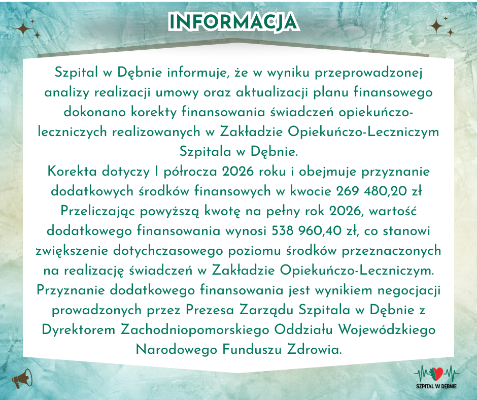 Informacja w sprawie finansowania świadczeń w Zakładzie Opiekuńczo-Leczniczym Szpitala w Dębnie.