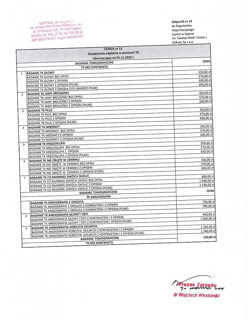 Tomografię komputerową można wykonać jedynie ze skierowaniem! CENNIK BĘDZIE OBOWIĄZYWAŁ OD 01.11.2025 R. CENNIK OBOWIĄZUJĄCY DO 31.10.2025 R.
