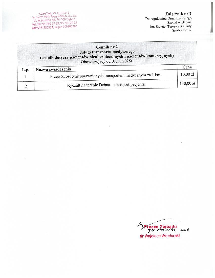 CENNIK OBOWIĄZUJĄCY DO 31.10.2025 R.