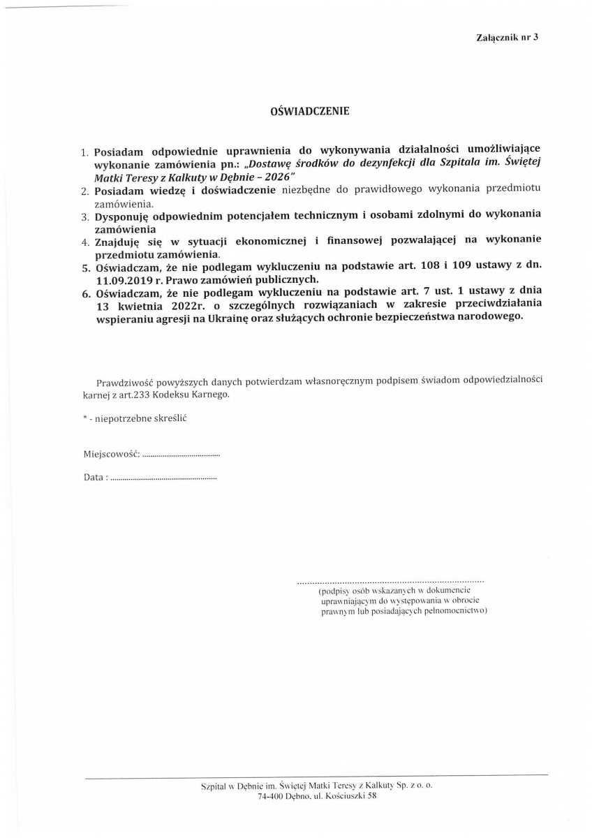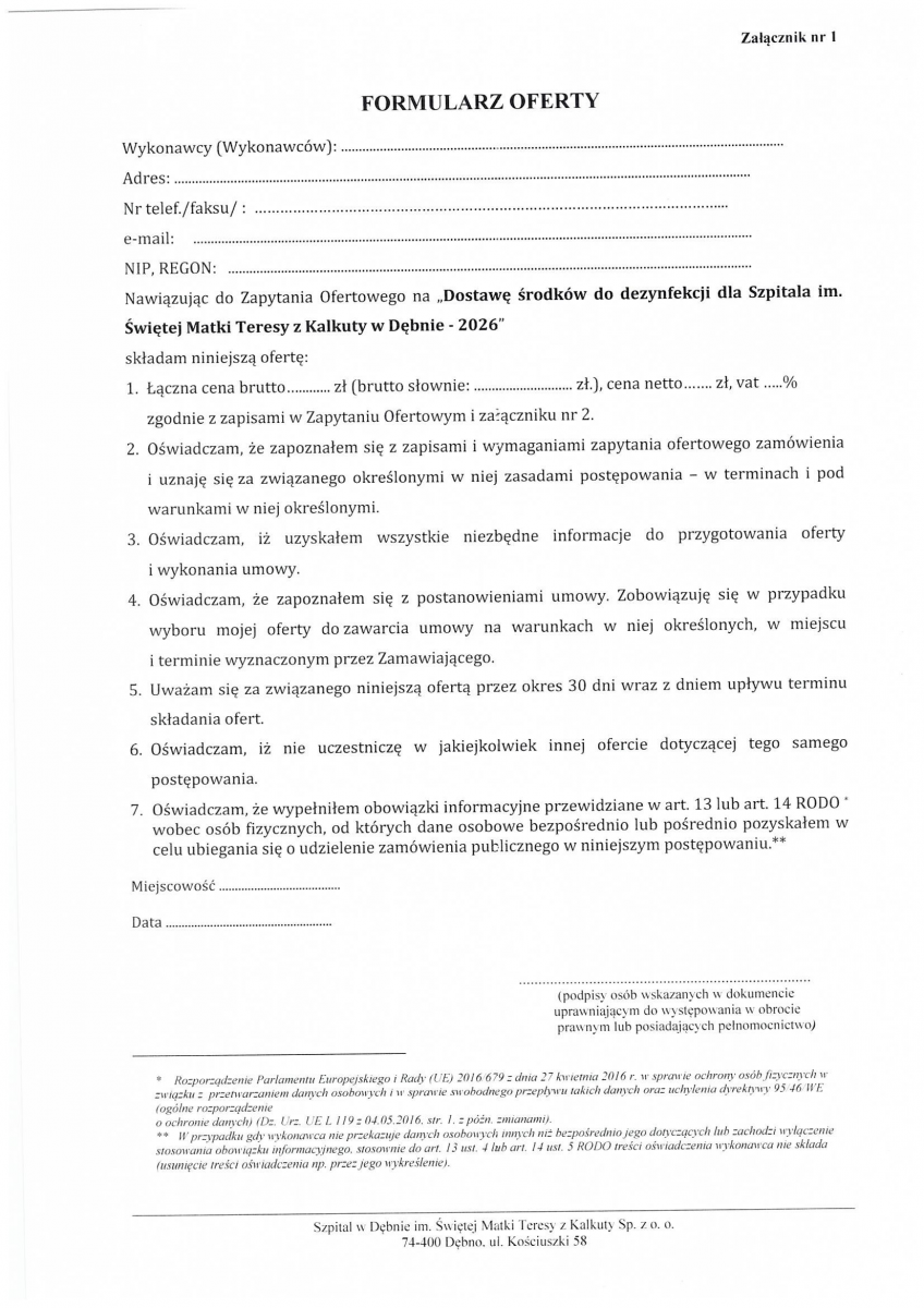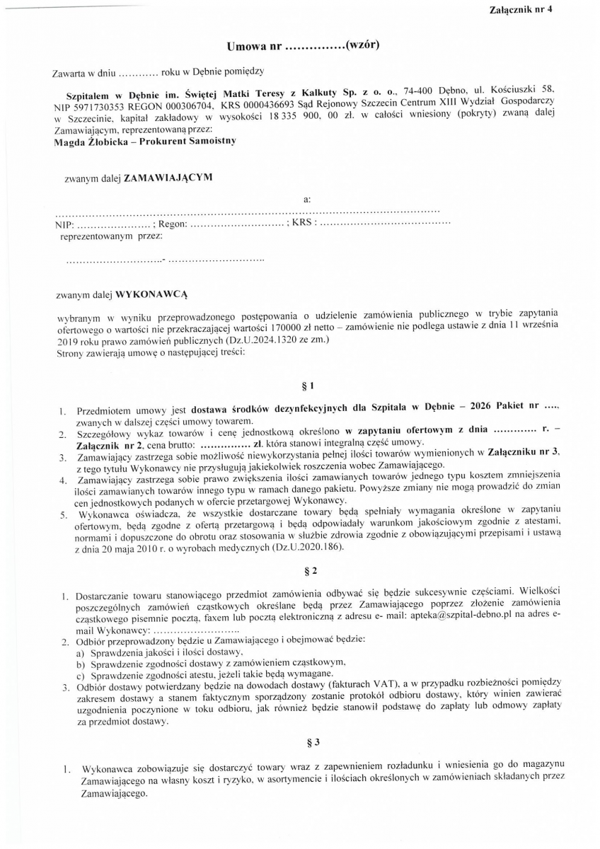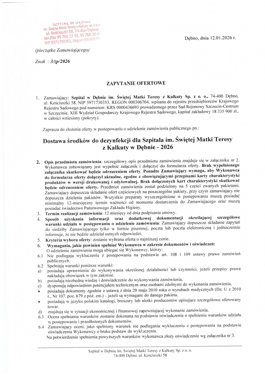 Zamówienie publiczne na dostawę środków dezynfekcyjnych dla Szpitala w Dębnie w 2026 roku.