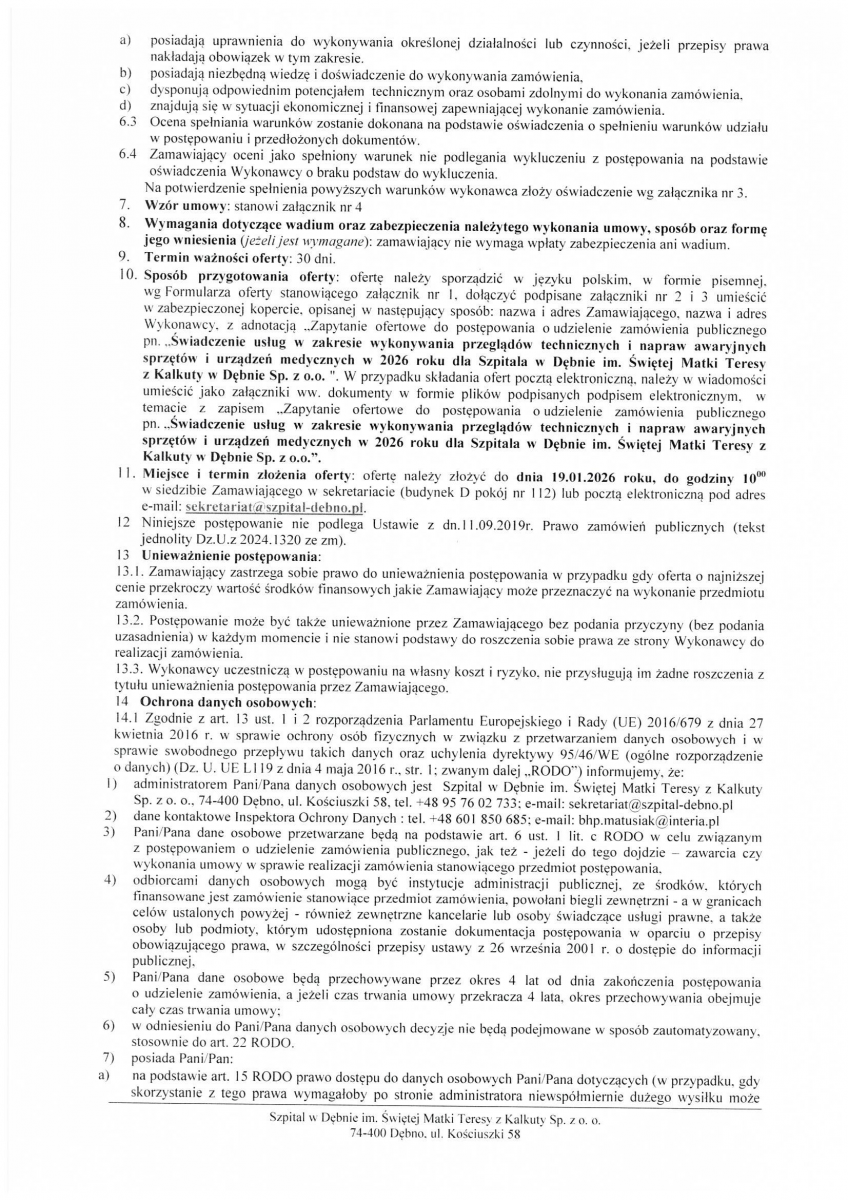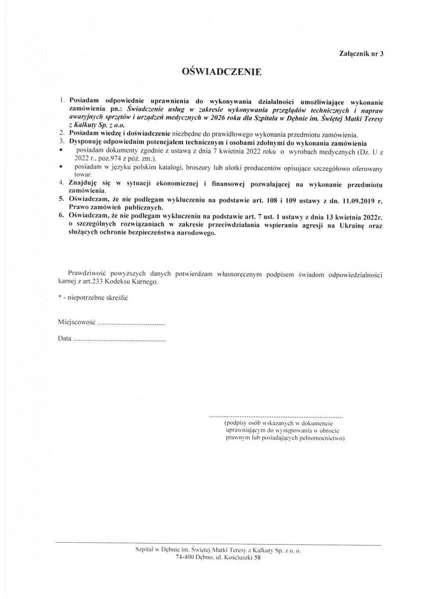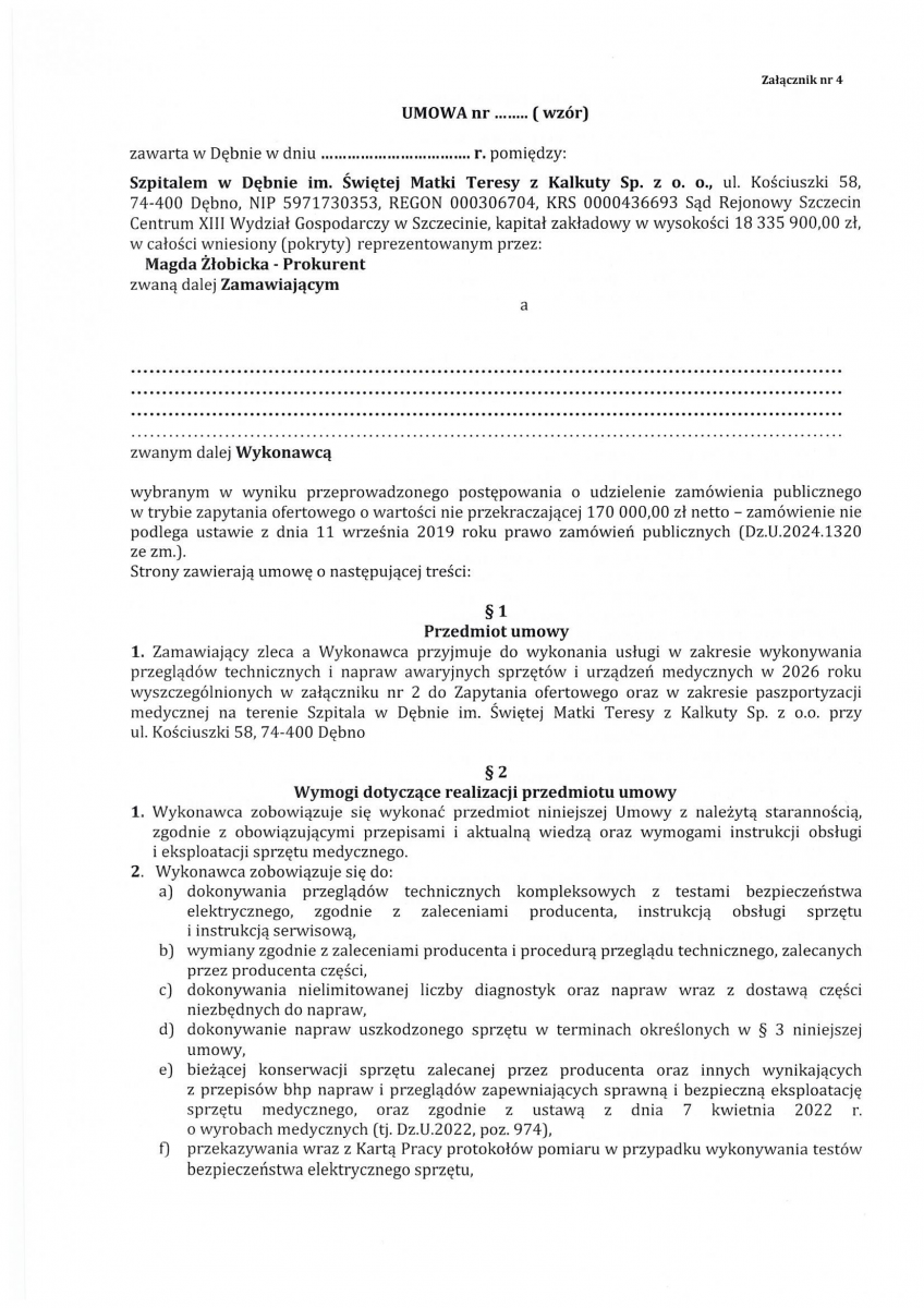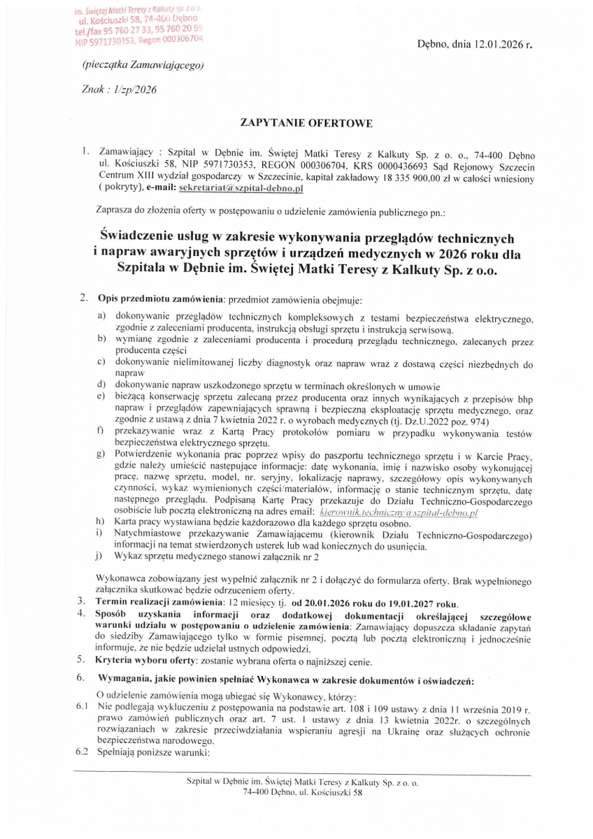 Zamówienie publiczne na świadczenie usług w zakresie wykonywania przeglądów technicznych i napraw awaryjnych sprzętów i urządzeń medycznych w 2026 roku.