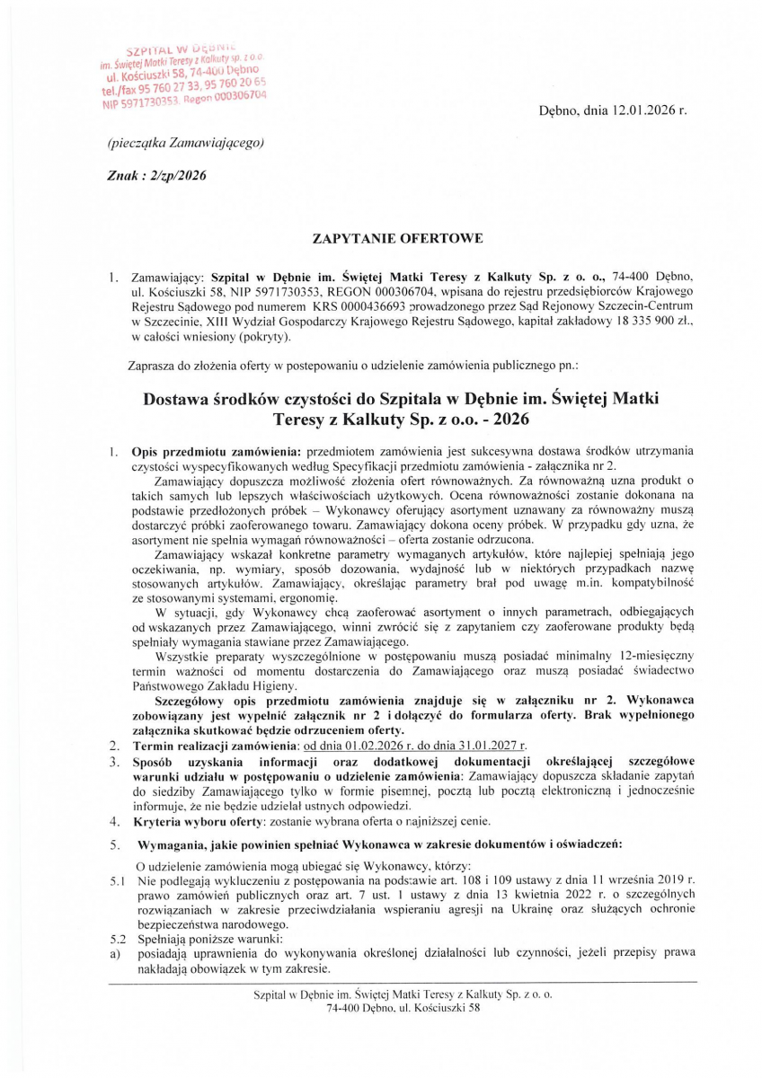 Zamównienie publiczne na dostawę środków czystości do Szpitala w Dębnie w 2026 roku.
