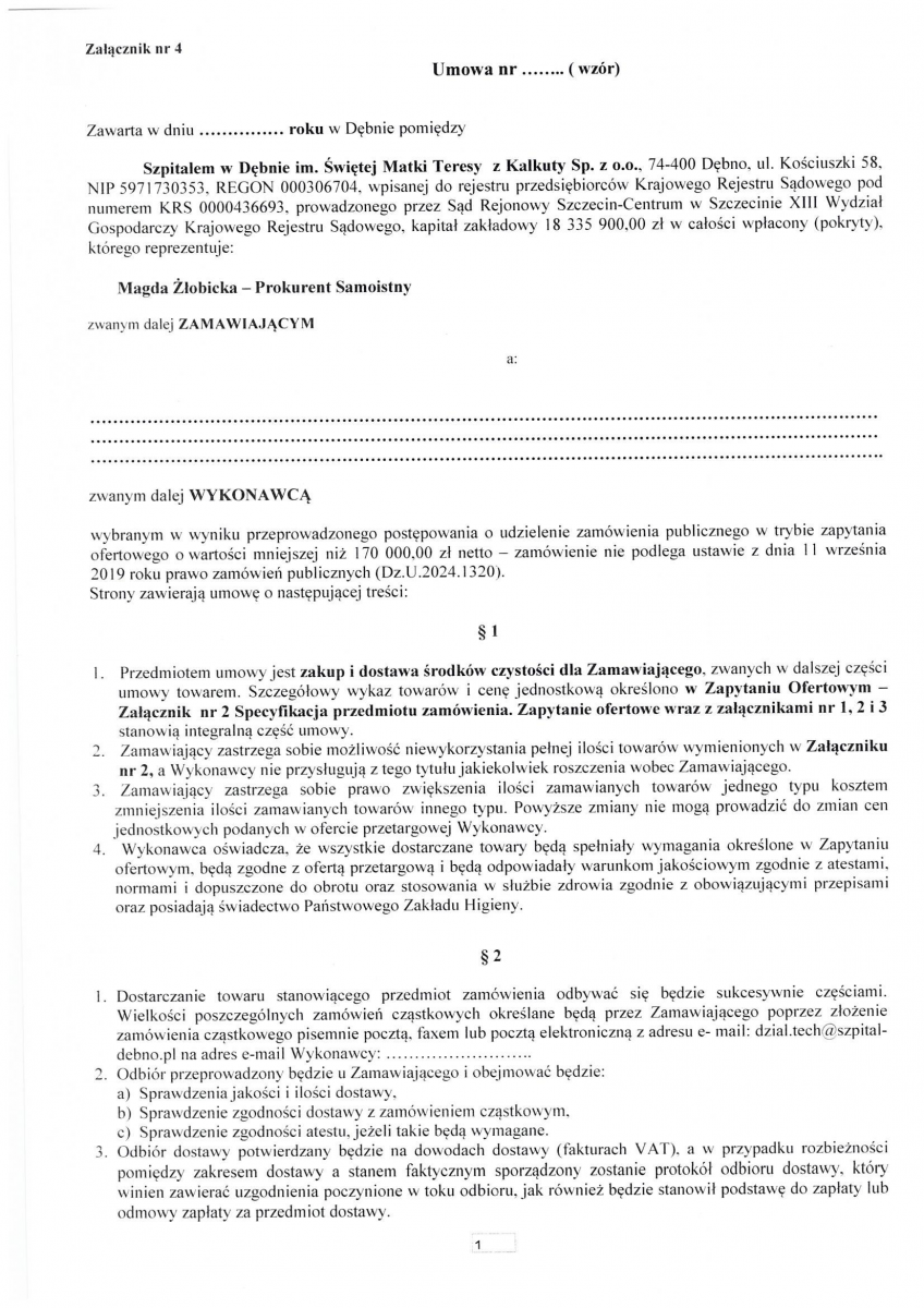 Zamówienie publiczne na dostawę środków dezynfekcyjnych dla Szpitala w Dębnie w 2026 roku.