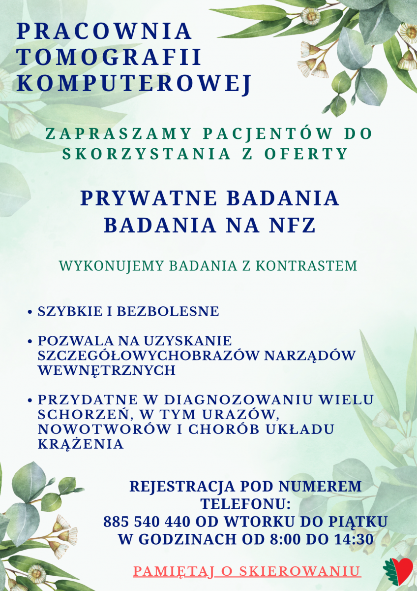 Zapraszamy pacjentów do skorzystania z oferty Pracowni Tomografii Komputerowej, prywatne badania oraz badania na NFZ.