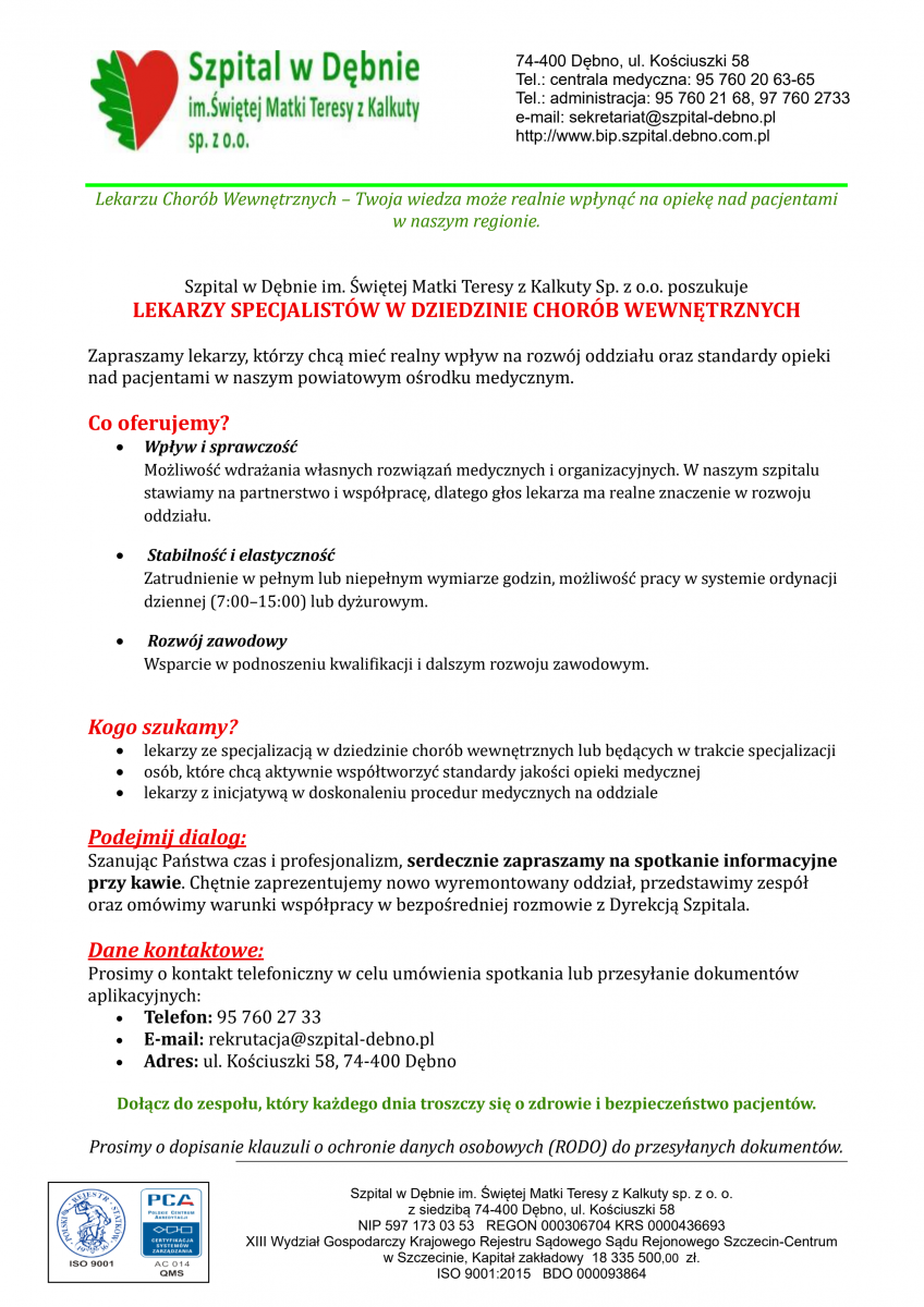 Ogłoszenie o konkursie na stanowisko: Prezesa Zarządu Spółki Szpital w Dębnie im. Świętej Matki Teresy z Kalkuty Sp. z o.o.