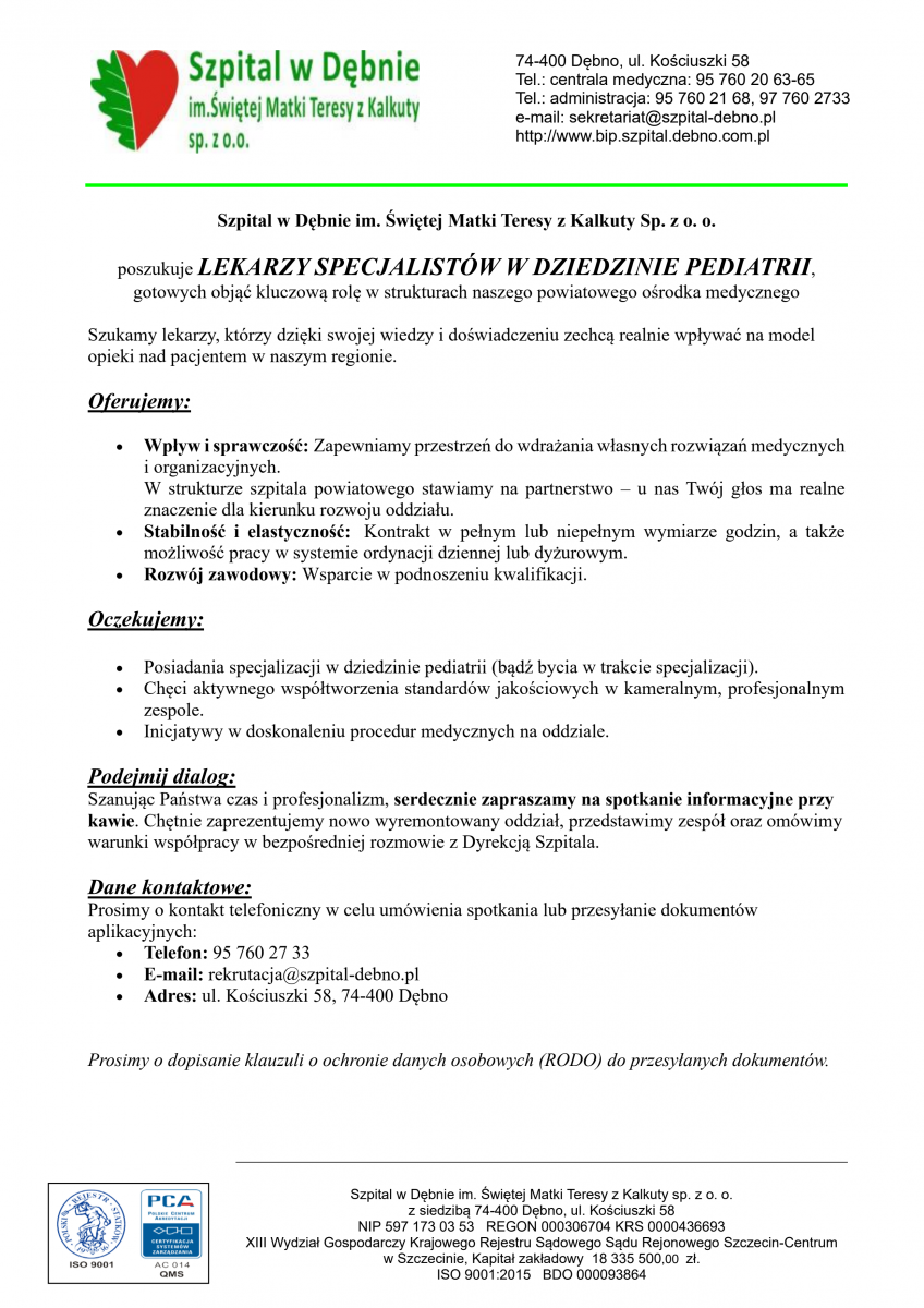 Zatrudnimy - LEKARZY SPECJALISTÓW W DZIEDZINIE PEDIATRII